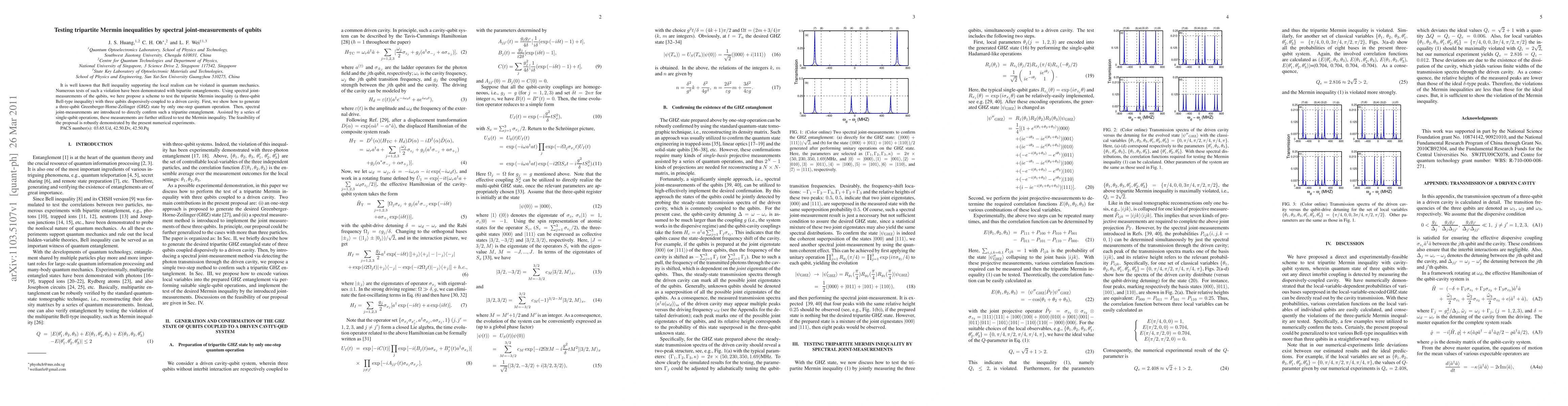 It is well known that Bell inequality supporting the local realism can be violated in quantum mechanics. Numerous tests of such a violation have been demonstrated with bipartite entanglements. Using spectral jointmeasurements of the qubits, we here propose a scheme to test the tripartite Mermin inequality (a three-qubit Bell-type inequality) with three qubits dispersively-coupled to a driven cavity. First, we show how to generate a three-qubit Greenberger-Horne-Zeilinger (GHZ) state by only one-step quantum operation. Then, spectral joint-measurements are introduced to directly confirm such a tripartite entanglement. Assisted by a series of single-qubit operations, these measurements are further utilized to test the Mermin inequality. The feasibility of the proposal is robustly demonstrated by the present numerical experiments.
