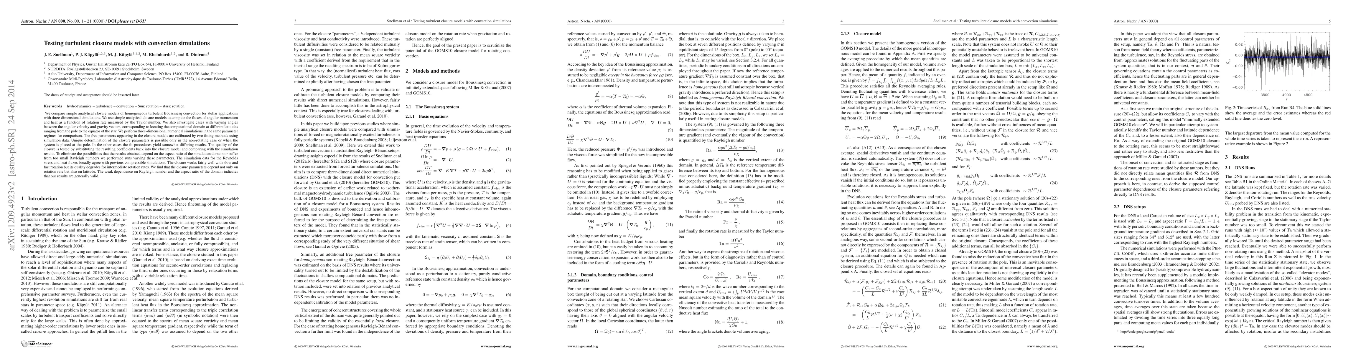 We compare simple analytical closure models of homogeneous turbulent Boussinesq convection for stellar applications with three-dimensional simulations. We use simple analytical closure models to compute the fluxes of angular momentum and heat as a function of rotation rate measured by the Taylor number. We also investigate cases with varying angles between the angular velocity and gravity vectors, corresponding to locating the computational domain at different latitudes ranging from the pole to the equator of the star. We perform three-dimensional numerical simulations in the same parameter regimes for comparison. The free parameters appearing in the closure models are calibrated by two fitting methods using simulation data. Unique determination of the closure parameters is possible only in the non-rotating case or when the system is placed at the pole. In the other cases the fit procedures yield somewhat differing results. The quality of the closure is tested by substituting the resulting coefficients back into the closure model and comparing with the simulation results. To eliminate the possibilities that the results obtained depend on the aspect ratio of the simulation domain or suffer from too small Rayleigh numbers we performed runs varying these parameters. The simulation data for the Reynolds stress and heat fluxes broadly agree with previous compressible simulations. The closure works fairly well with slow and fast rotation but its quality degrades for intermediate rotation rates. We find that the closure parameters depend not only on rotation rate but also on latitude. The weak dependence on Rayleigh number and the aspect ratio of the domain indicates that our results are generally valid
