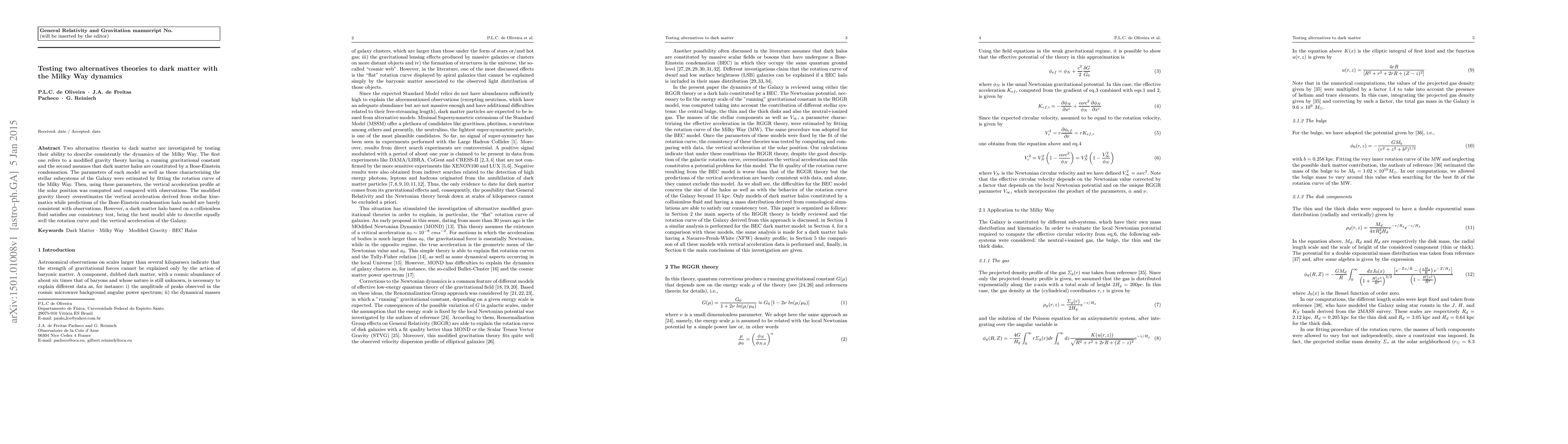This paper tests two alternative dark matter theories—modified gravity with a running gravitational constant and a Bose-Einstein condensation—against Milky Way dynamics. While the modified gravity model overestimates vertical acceleration, the Bose-Einstein condensation model is barely consistent, with a collisionless fluid dark matter halo being the best fit.