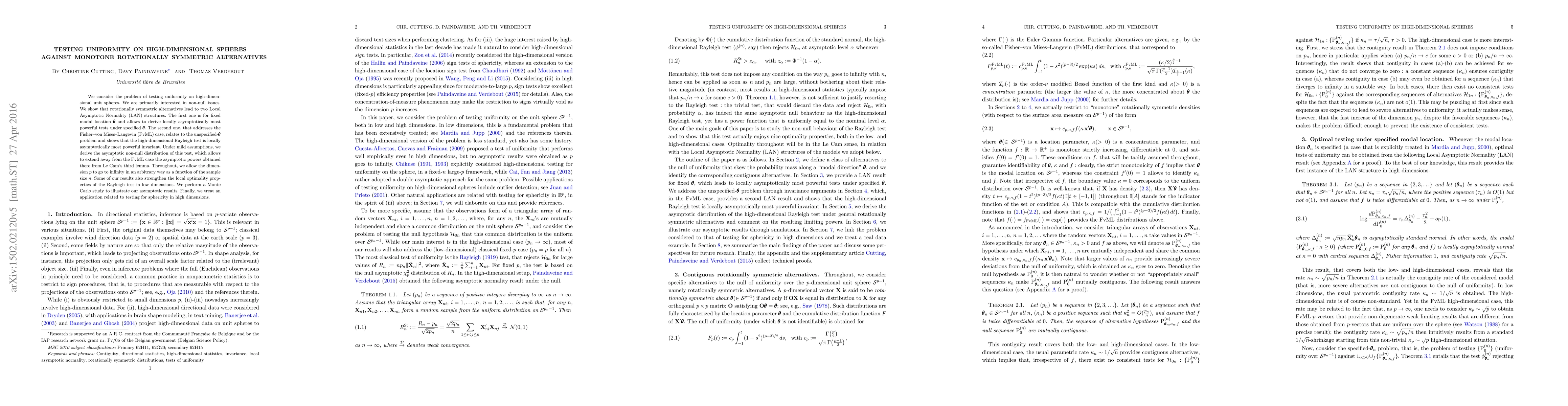 This paper develops tests for uniformity on high-dimensional unit spheres against monotone rotationally symmetric alternatives, identifying two Local Asymptotic Normality structures. It shows the Rayleigh test's local asymptotic optimality and derives its asymptotic non-null distribution, extending its power beyond the Fisher-von Mises-Langevin case.