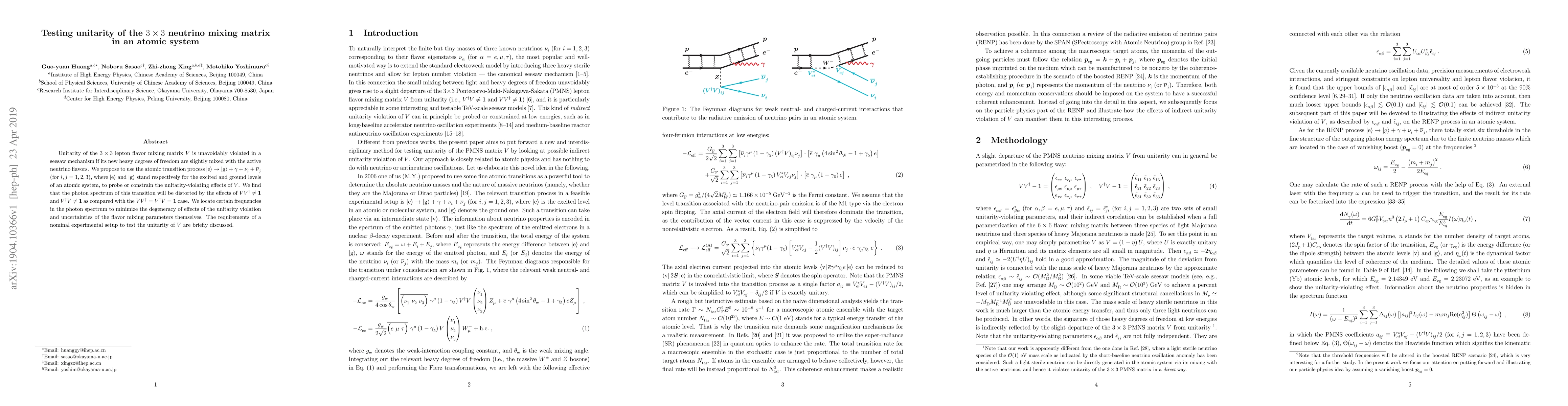 This paper proposes using atomic transition processes to test the unitarity of the $3\times 3$ neutrino mixing matrix $V$, which may be violated in seesaw mechanisms. The study identifies specific frequencies in the photon spectrum that can reveal deviations from unitarity, providing a method for experimental verification.