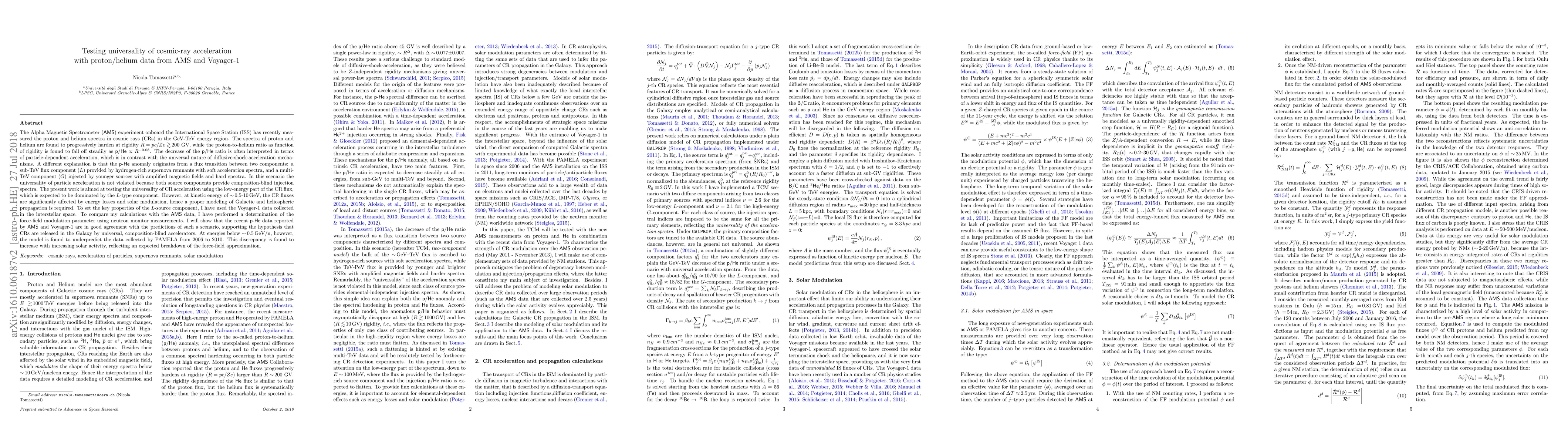 The study tests a model suggesting cosmic-ray acceleration is universal across particle types, using data from AMS and Voyager-1 experiments, which finds agreement with the predictions but notes discrepancies at lower energies.
