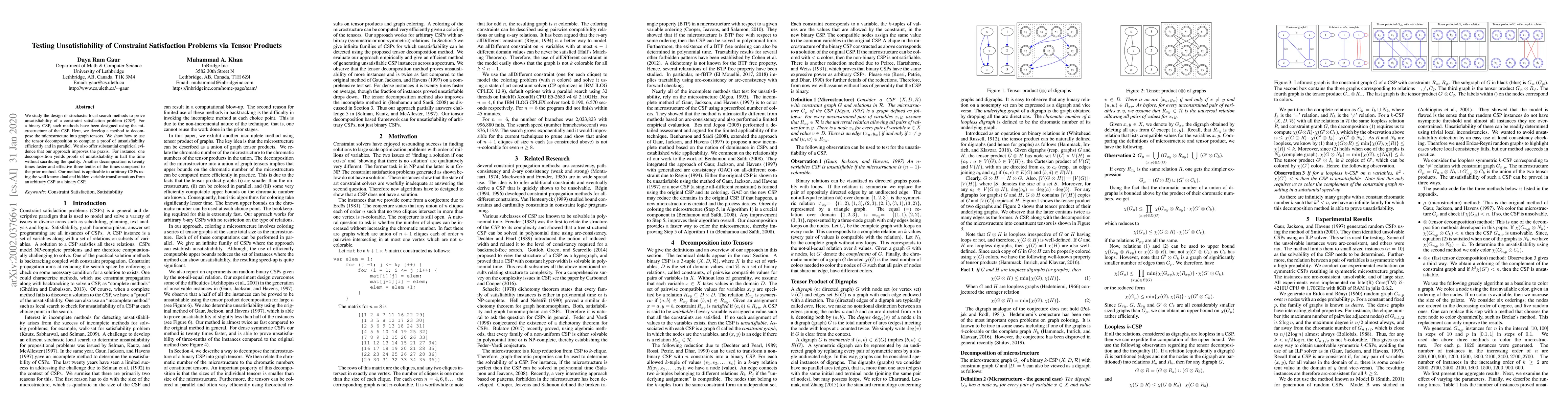 We study the design of stochastic local search methods to prove unsatisfiability of a constraint satisfaction problem (CSP). For a binary CSP, such methods have been designed using the microstructure of the CSP. Here, we develop a method to decompose the microstructure into graph tensors. We show how to use the tensor decomposition to compute a proof of unsatisfiability efficiently and in parallel. We also offer substantial empirical evidence that our approach improves the praxis. For instance, one decomposition yields proofs of unsatisfiability in half the time without sacrificing the quality. Another decomposition is twenty times faster and effective three-tenths of the times compared to the prior method. Our method is applicable to arbitrary CSPs using the well known dual and hidden variable transformations from an arbitrary CSP to a binary CSP.