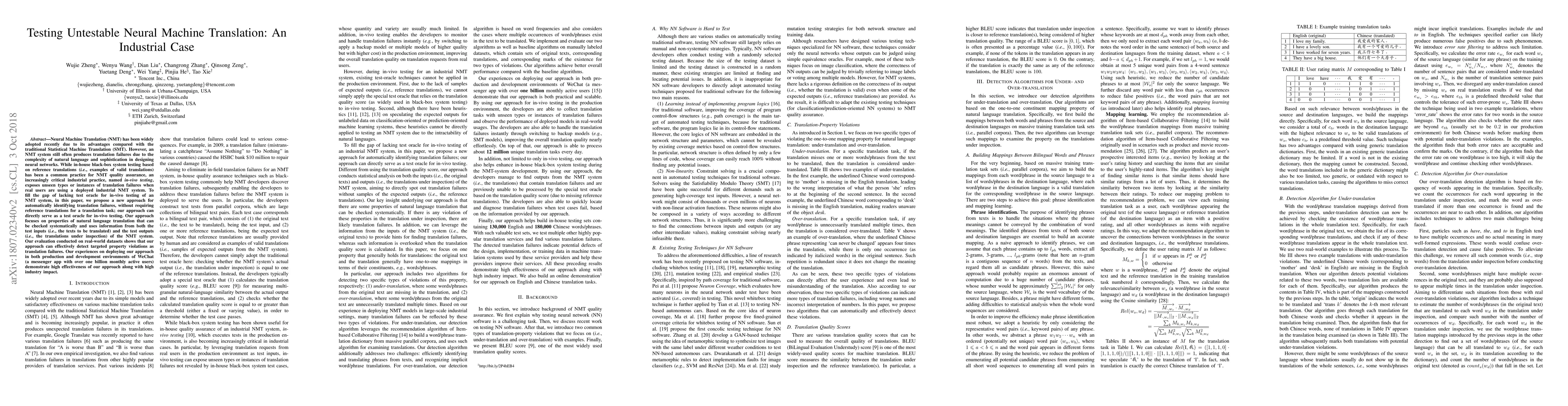 This paper proposes an innovative method for automatically identifying translation failures in Neural Machine Translation (NMT) systems without requiring reference translations, addressing the challenge of in-vivo testing. The approach systematically checks properties of natural language translation using both input and output data, demonstrating effectiveness in detecting property violations and high impact in real-world industrial deployment at WeChat.