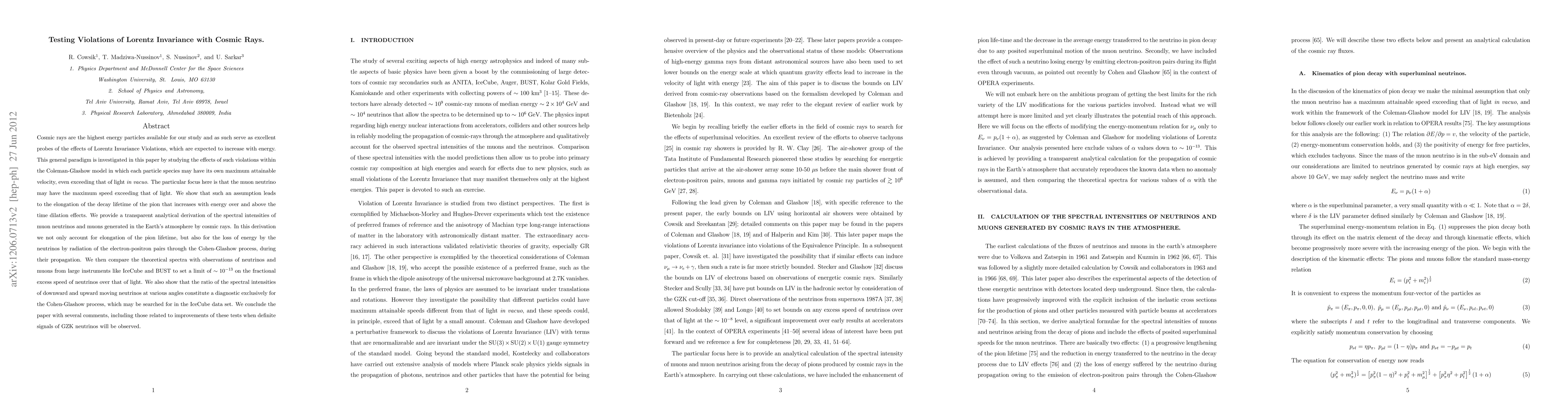 Researchers used cosmic rays to test for violations of Lorentz Invariance, finding that a faster-than-light muon neutrino would lead to longer pion decay lifetimes and distinct spectral patterns in neutrinos and muons.
