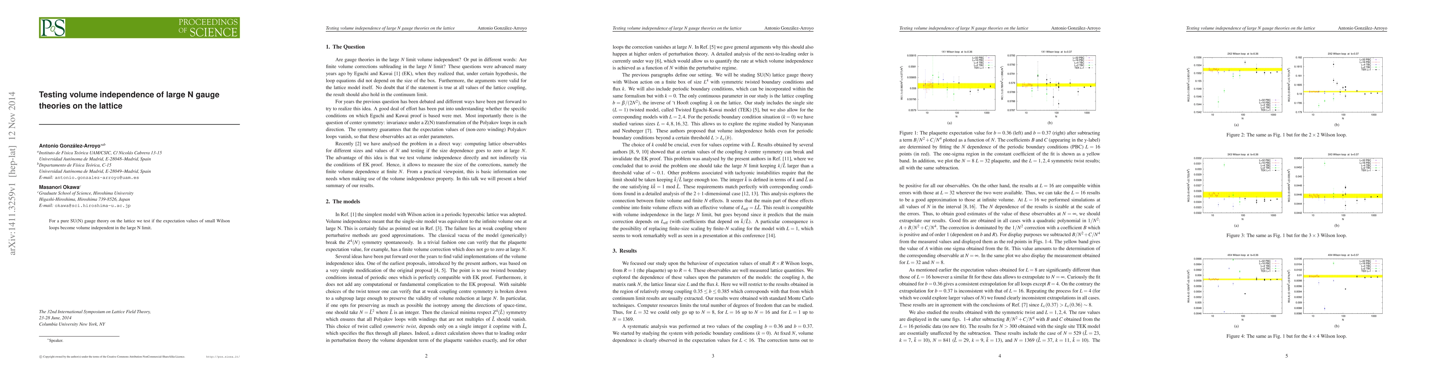 Summary: This study investigates the volume independence of expectation values of small Wilson loops in large N limit SU(N) gauge theories on the lattice, aiming to determine if these values stabilize as the system size increases.