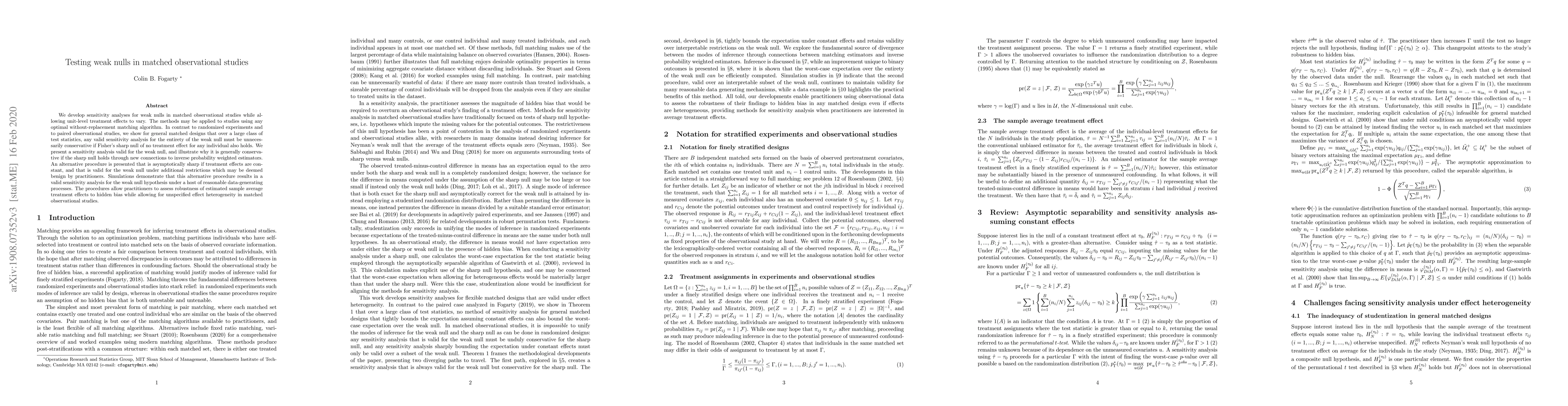 This paper develops sensitivity analyses for assessing weak nulls in matched observational studies, showing that traditional methods are overly conservative. It introduces a new procedure that is valid for the weak null and demonstrates its effectiveness through simulations, allowing for unspecified effect heterogeneity and robust assessment of treatment effects.