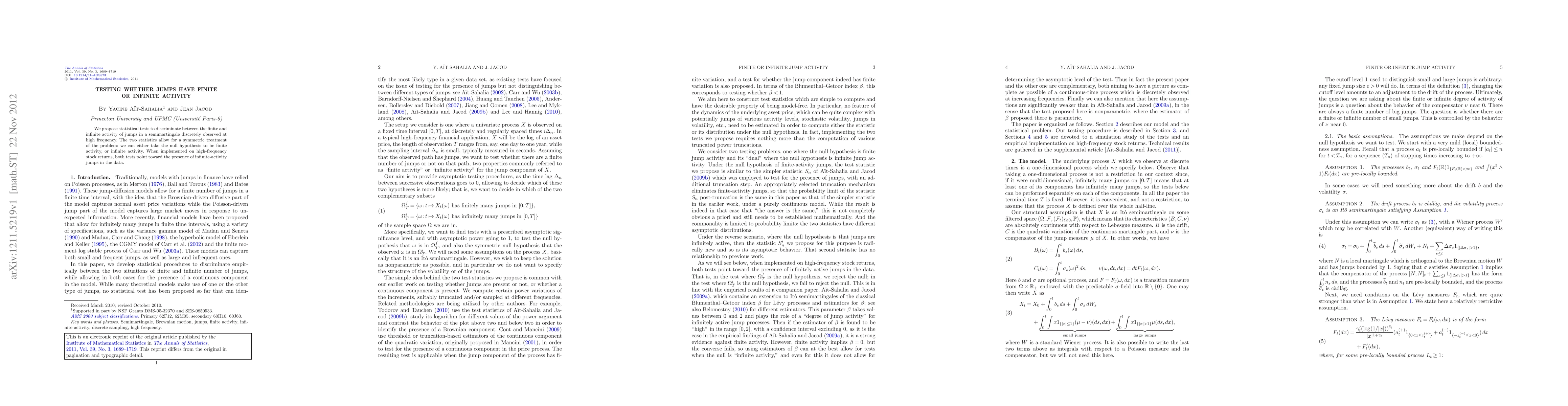 Researchers proposed statistical tests to determine if financial stock returns exhibit finite or infinite activity through high-frequency observation. Both tests found evidence of infinite-activity jumps in the data.