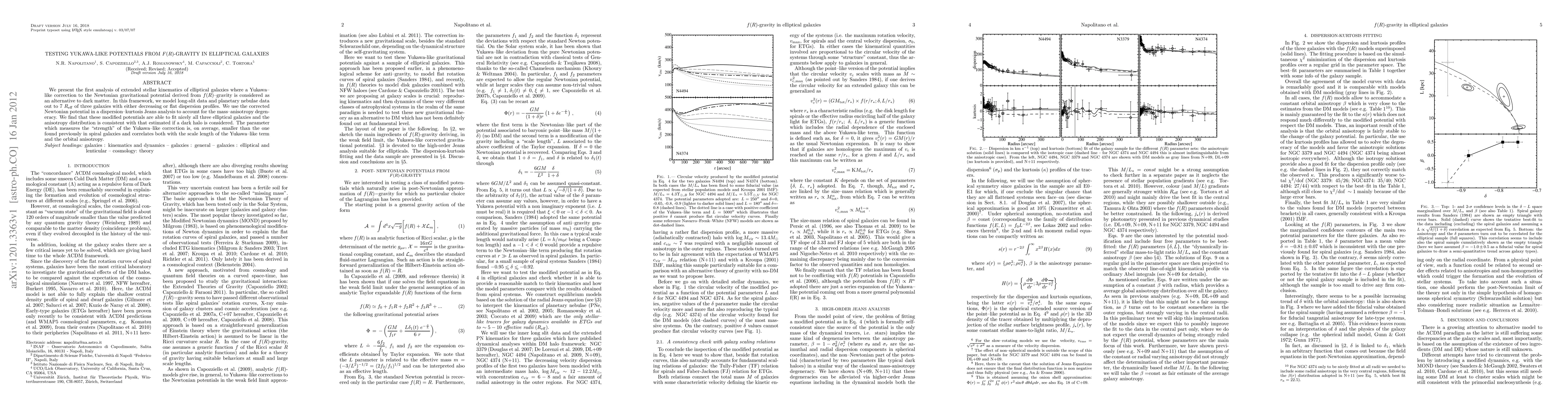 This paper investigates the use of Yukawa-like potentials from f(R)-gravity as an alternative to dark matter in elliptical galaxies, finding that these potentials can fit stellar kinematics well and correlate with galaxy scale length and orbital anisotropy. The study concludes that the strength of the Yukawa-like correction is generally smaller than in spiral galaxies.