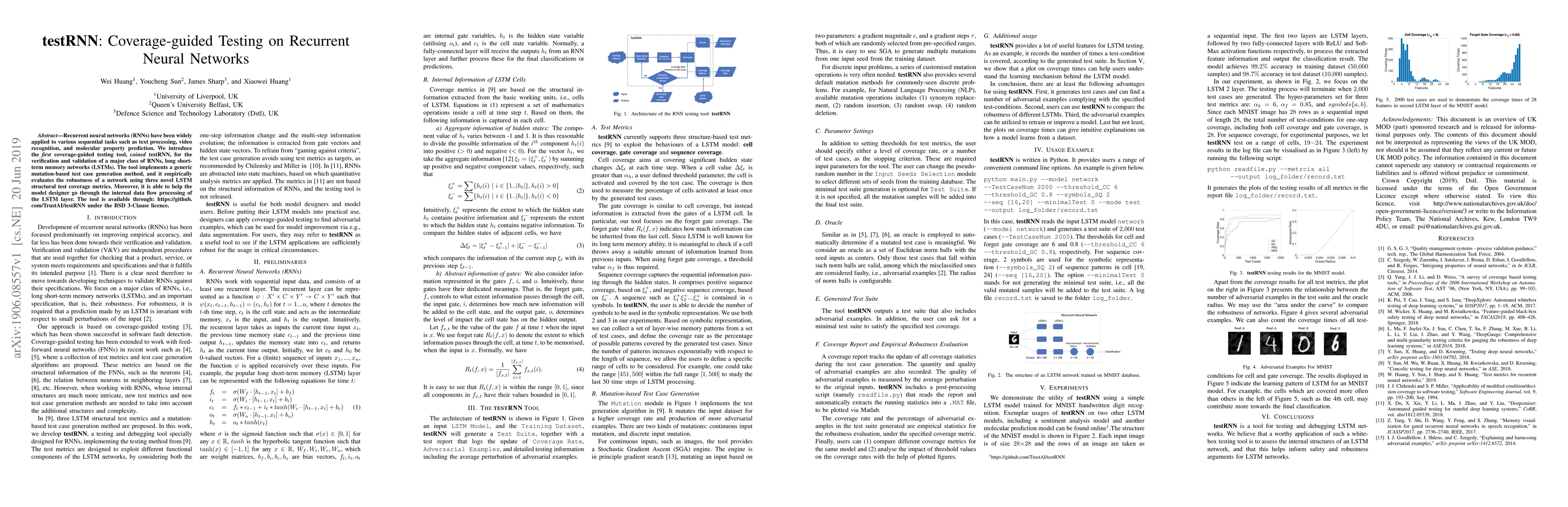 This paper introduces testRNN, a coverage-guided testing tool for verifying and validating long short-term memory networks (LSTMs). It employs mutation-based test case generation and evaluates robustness using three novel structural test coverage metrics.