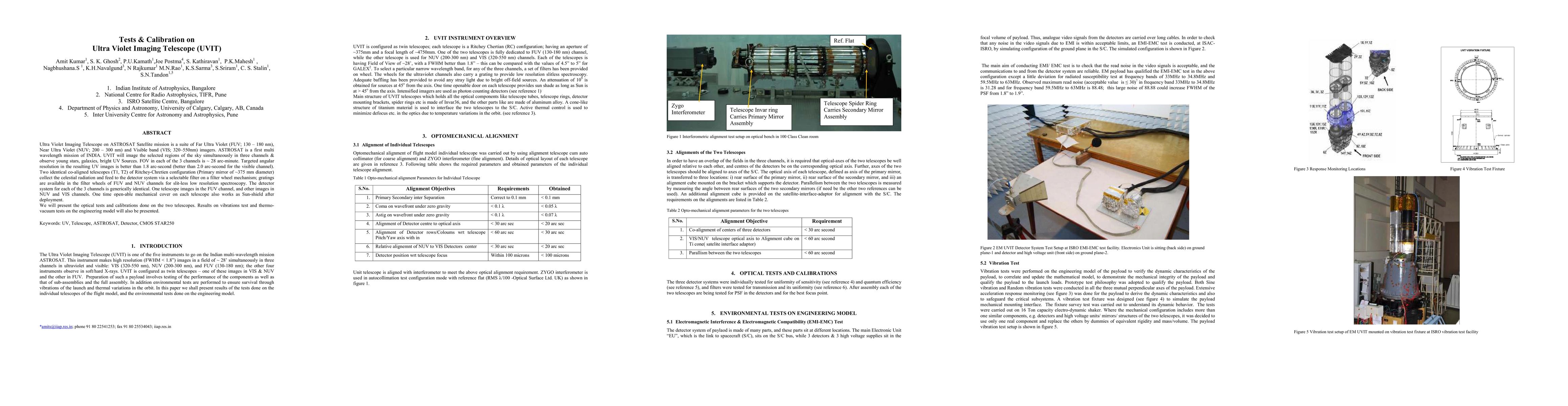 This paper details the optical tests and calibrations performed on the Ultra Violet Imaging Telescope (UVIT) aboard India's ASTROSAT satellite, which observes the sky in Far Ultra Violet, Near Ultra Violet, and Visible bands. It also reports on vibration and thermo-vacuum tests on the engineering model, ensuring the telescope's readiness for astronomical observations.