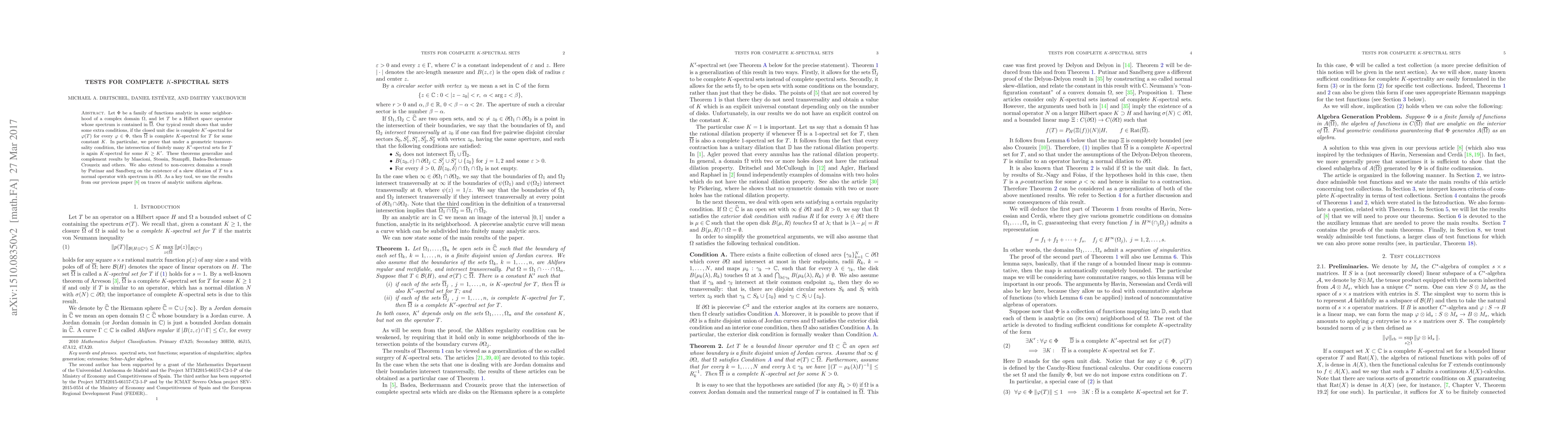 Let $\Phi$ be a family of functions analytic in some neighborhood of a complex domain $\Omega$, and let $T$ be a Hilbert space operator whose spectrum is contained in $\overline\Omega$. Our typical result shows that under some extra conditions, if the closed unit disc is complete $K'$-spectral for $\phi(T)$ for every $\phi\in \Phi$, then $\overline\Omega$ is complete $K$-spectral for $T$ for some constant $K$. In particular, we prove that under a geometric transversality condition, the intersection of finitely many $K'$-spectral sets for $T$ is again $K$-spectral for some $K\ge K'$. These theorems generalize and complement results by Mascioni, Stessin, Stampfli, Badea-Beckerman-Crouzeix and others. We also extend to non-convex domains a result by Putinar and Sandberg on the existence of a skew dilation of $T$ to a normal operator with spectrum in $\partial\Omega$. As a key tool, we use the results from our previous paper on traces of analytic uniform algebras.
