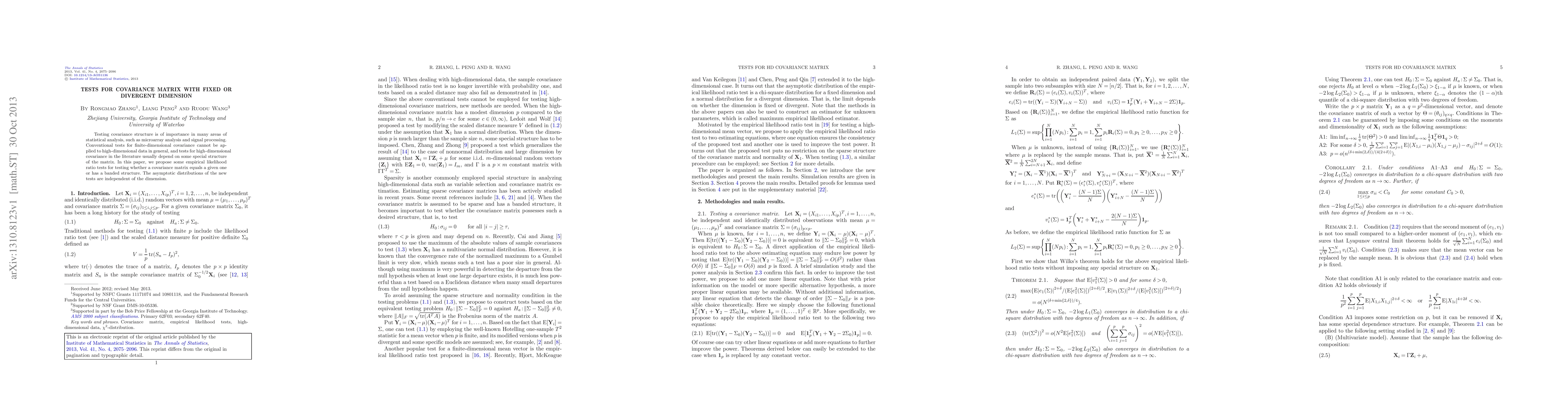 This paper proposes empirical likelihood ratio tests for high-dimensional covariance matrices, allowing for testing against a given matrix or a banded structure. The proposed tests' asymptotic distributions remain valid regardless of the dimension, addressing limitations of conventional finite-dimensional tests.