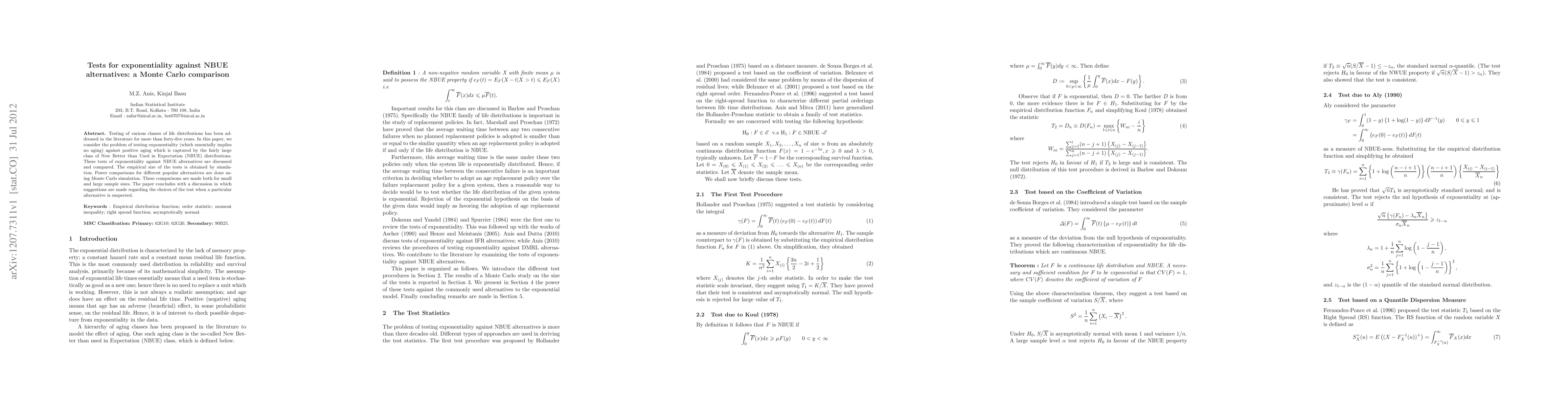 This paper compares various statistical tests for exponentiality against new better than used in expectation (NBUE) alternatives through Monte Carlo simulations. The study evaluates the empirical size and power of these tests across different sample sizes, providing recommendations for selecting appropriate tests based on suspected alternatives.