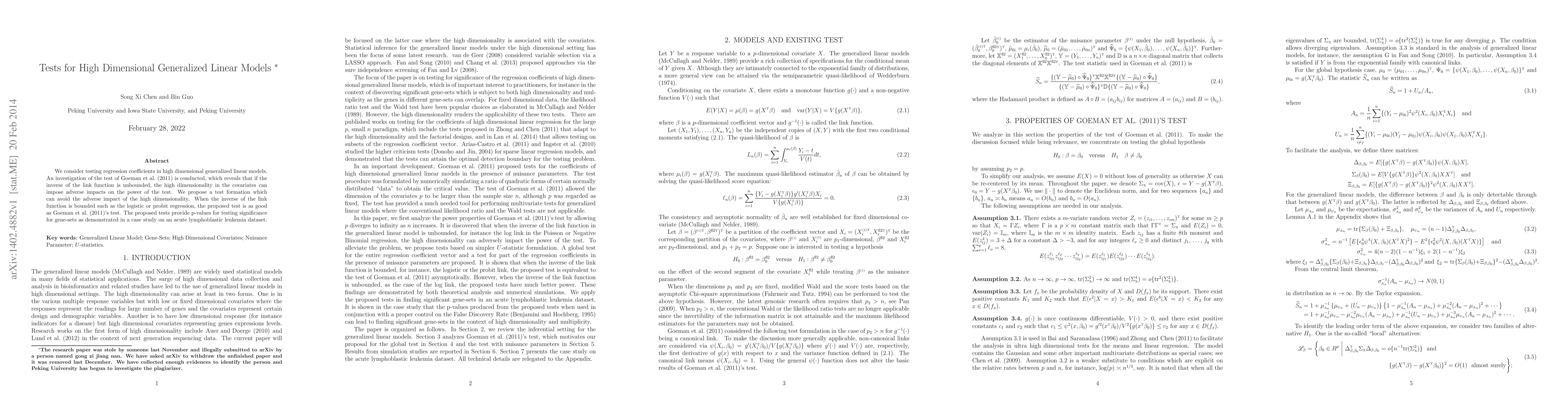 This paper investigates testing regression coefficients in high-dimensional generalized linear models, finding that Goeman et al.'s test can be adversely affected by high dimensionality when the inverse of the link function is unbounded. The authors propose an improved test to mitigate this issue, which performs comparably to the existing test when the link function is bounded, as demonstrated in a leukemia dataset case study.