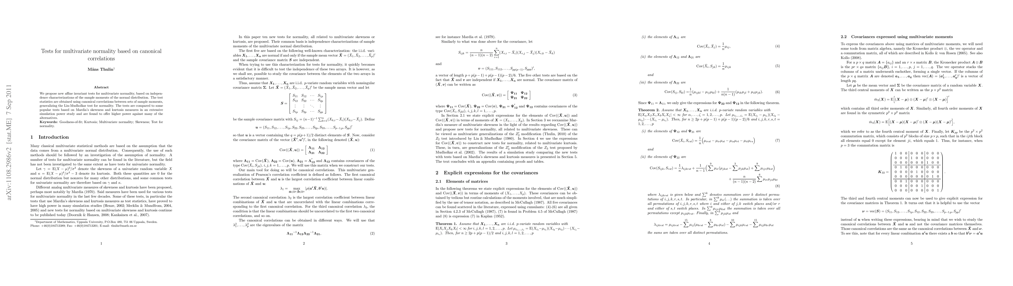 This paper introduces new affine invariant tests for multivariate normality based on canonical correlations between sample moments, outperforming existing tests like Mardia's skewness and kurtosis measures in a simulation power study. The proposed tests generalize the Lin-Mudholkar test and show higher power against various alternatives.