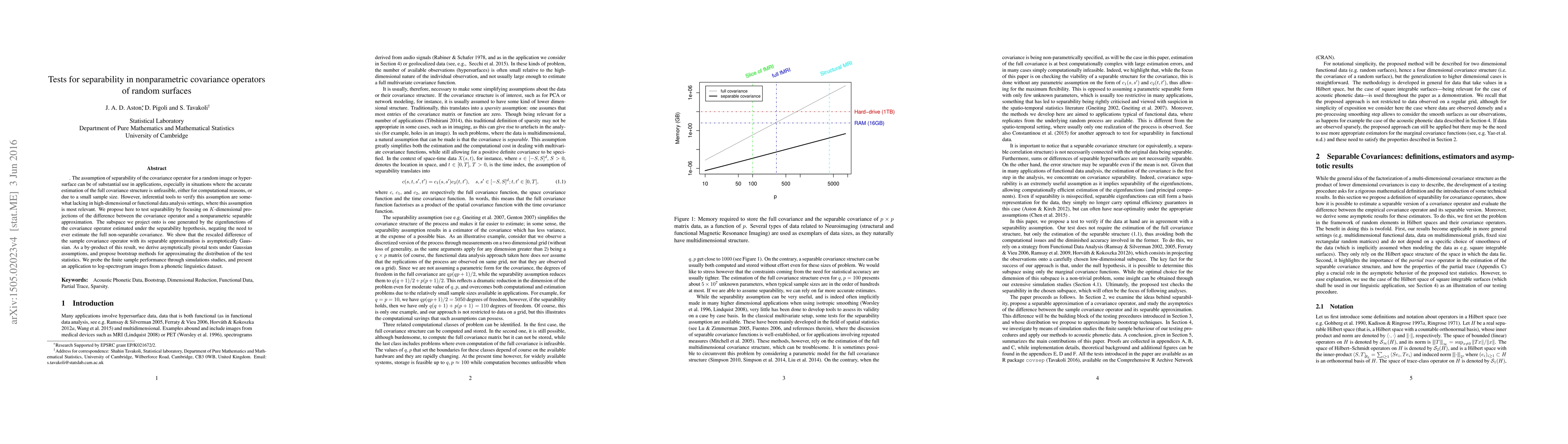 The assumption of separability of the covariance operator for a random image or hypersurface can be of substantial use in applications, especially in situations where the accurate estimation of the full covariance structure is unfeasible, either for computational reasons, or due to a small sample size. However, inferential tools to verify this assumption are somewhat lacking in high-dimensional or functional {data analysis} settings, where this assumption is most relevant. We propose here to test separability by focusing on $K$-dimensional projections of the difference between the covariance operator and a nonparametric separable approximation. The subspace we project onto is one generated by the eigenfunctions of the covariance operator estimated under the separability hypothesis, negating the need to ever estimate the full non-separable covariance. We show that the rescaled difference of the sample covariance operator with its separable approximation is asymptotically Gaussian. As a by-product of this result, we derive asymptotically pivotal tests under Gaussian assumptions, and propose bootstrap methods for approximating the distribution of the test statistics. We probe the finite sample performance through simulations studies, and present an application to log-spectrogram images from a phonetic linguistics dataset.
