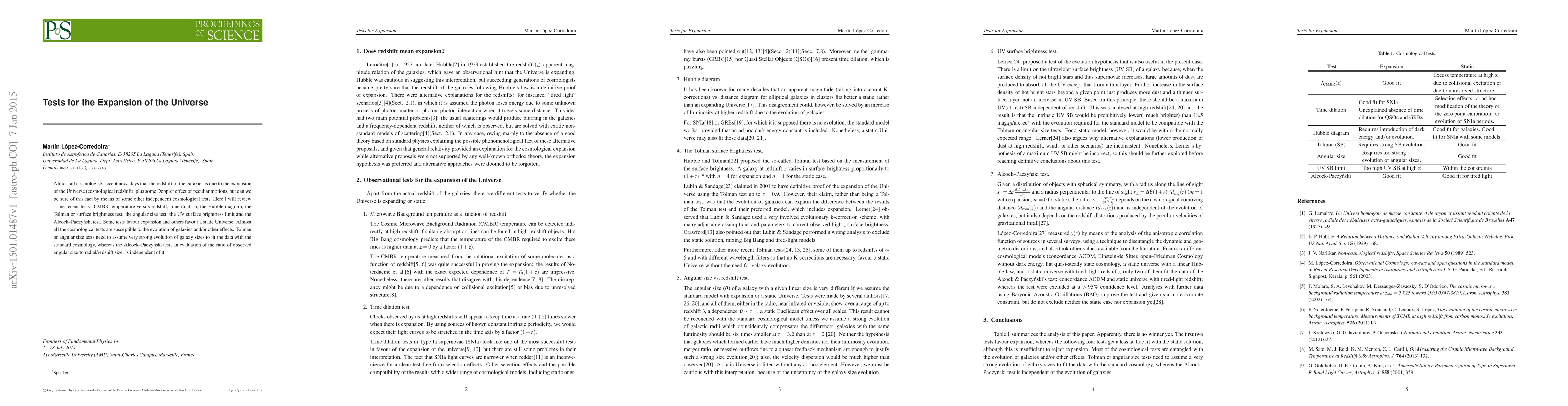 Almost all cosmologists accept nowadays that the redshift of the galaxies is due to the expansion of the Universe (cosmological redshift), plus some Doppler effect of peculiar motions, but can we be sure of this fact by means of some other independent cosmological test? Here I will review some recent tests: CMBR temperature versus redshift, time dilation, the Hubble diagram, the Tolman or surface brightness test, the angular size test, the UV surface brightness limit and the Alcock--Paczy\'nski test. Some tests favour expansion and others favour a static Universe. Almost all the cosmological tests are susceptible to the evolution of galaxies and/or other effects. Tolman or angular size tests need to assume very strong evolution of galaxy sizes to fit the data with the standard cosmology, whereas the Alcock--Paczynski test, an evaluation of the ratio of observed angular size to radial/redshift size, is independent of it.