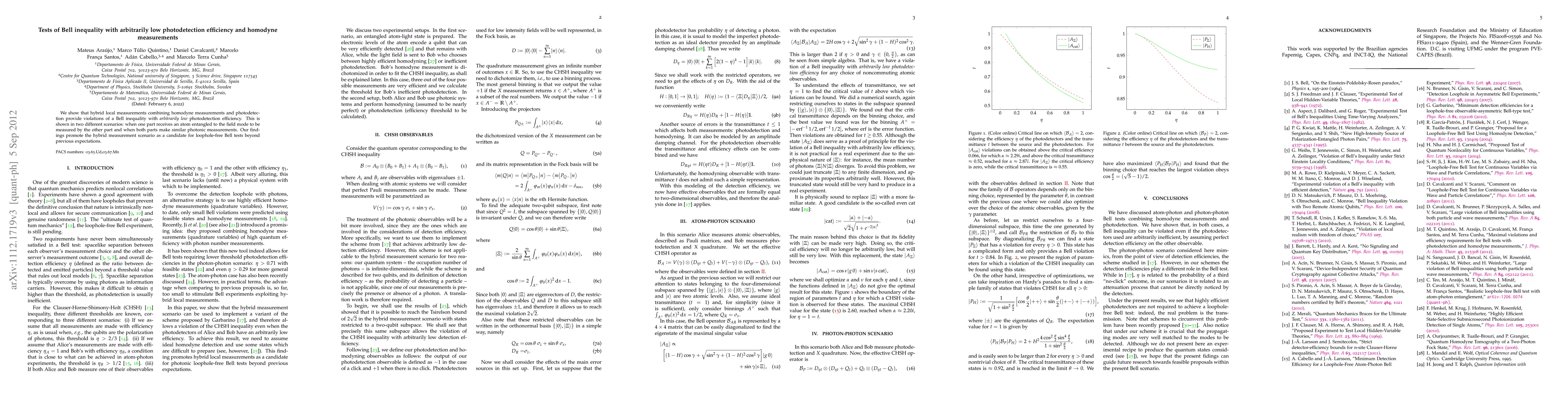 We show that hybrid local measurements combining homodyne measurements and photodetection provide violations of a Bell inequality with arbitrarily low photodetection efficiency. This is shown in two different scenarios: when one part receives an atom entangled to the field mode to be measured by the other part and when both parts make similar photonic measurements. Our findings promote the hybrid measurement scenario as a candidate for loophole-free Bell tests beyond previous expectations.