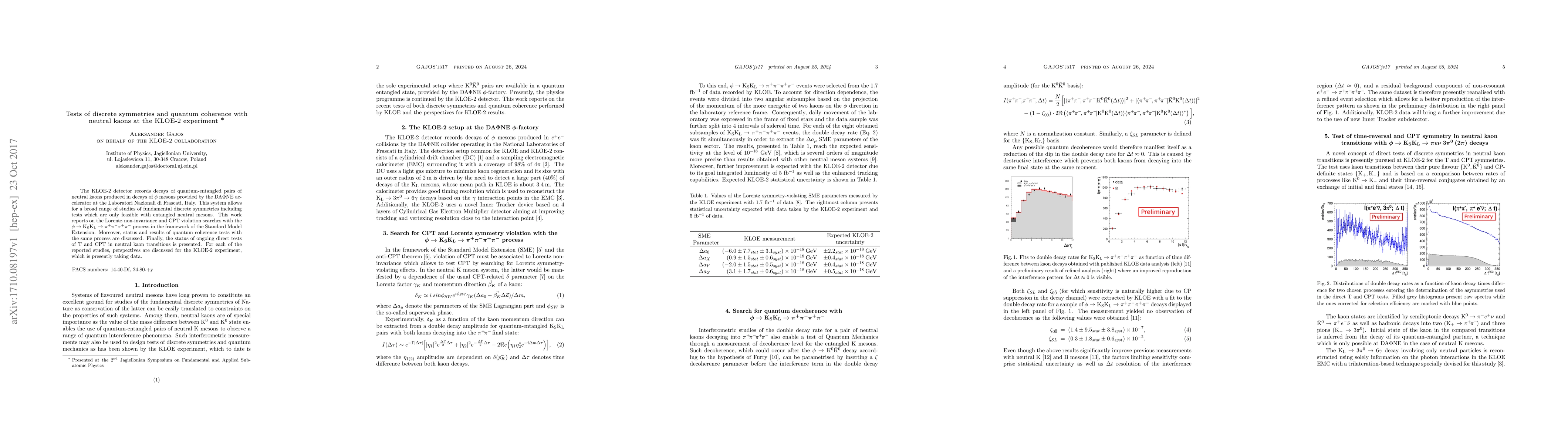 The KLOE-2 experiment investigates discrete symmetries and quantum coherence using entangled neutral kaons from phi meson decays at the DAFNE accelerator. It reports on searches for Lorentz non-invariance and CPT violation, alongside quantum coherence tests, and discusses ongoing direct tests of T and CPT in neutral kaon transitions.