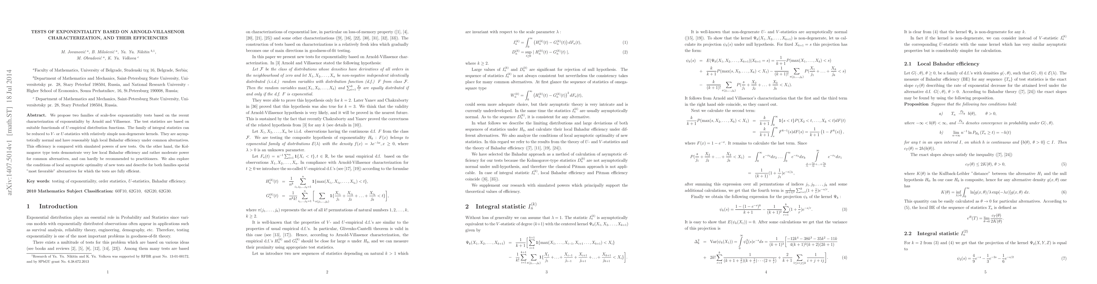 We propose two families of scale-free exponentiality tests based on the recent characterization of exponentiality by Arnold and Villasenor. The test statistics are based on suitable functionals of U-empirical distribution functions. The family of integral statistics can be reduced to V- or U-statistics with relatively simple non-degenerate kernels. They are asymptotically normal and have reasonably high local Bahadur efficiency under common alternatives. This efficiency is compared with simulated powers of new tests. On the other hand, the Kolmogorov type tests demonstrate very low local Bahadur efficiency and rather moderate power for common alternatives,and can hardly be recommended to practitioners. We also explore the conditions of local asymptotic optimality of new tests and describe for both families special "most favorable" alternatives for which the tests are fully efficient.
