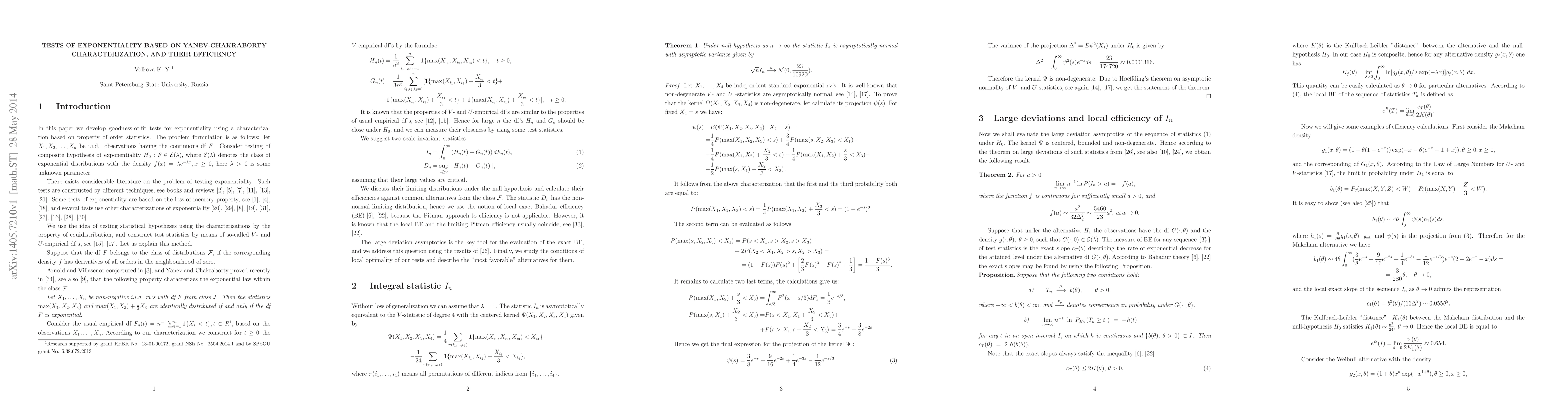 This paper develops new tests for exponentiality based on Yanev-Chakraborty's characterization and evaluates their efficiency through limiting distributions and local Bahadur efficiency against common alternatives. It also discusses the conditions under which these tests achieve local asymptotic optimality.