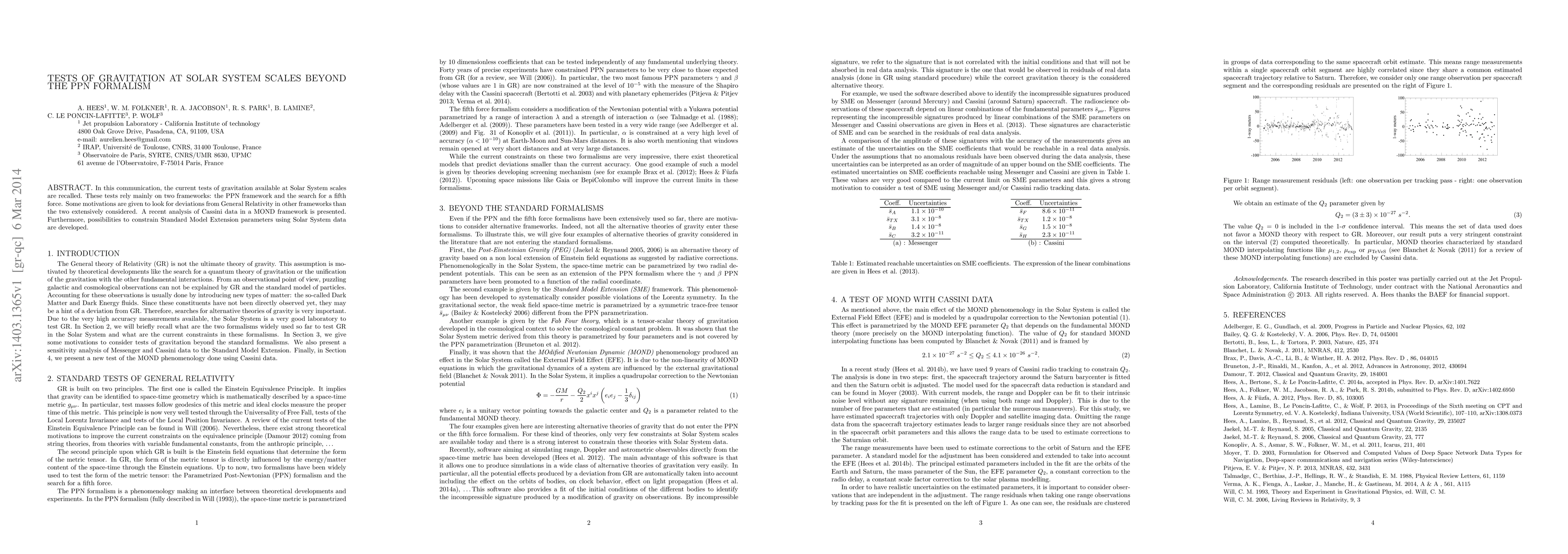 Researchers analyzed Cassini data using the MOND framework to search for deviations from General Relativity in the Solar System. They also explored constraining Standard Model Extension parameters with Solar System data.
