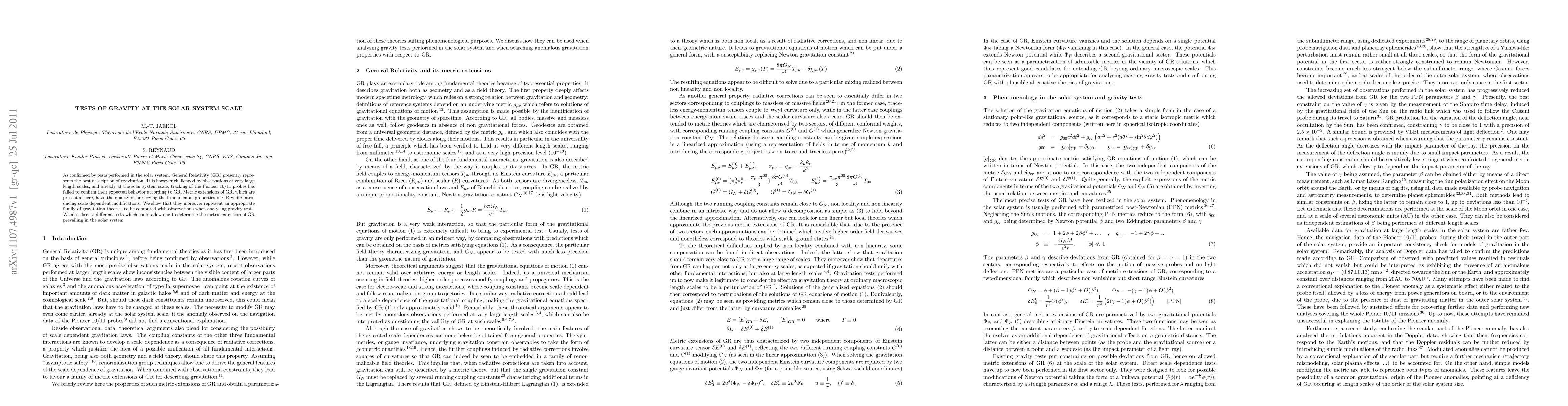 This paper examines metric extensions of General Relativity (GR) that preserve its fundamental properties while introducing scale-dependent modifications, offering a framework for comparing these theories with solar system observations, particularly addressing anomalies in the tracking of Pioneer 10/11 probes. The study proposes various tests to determine the prevailing metric extension of GR in the solar system.