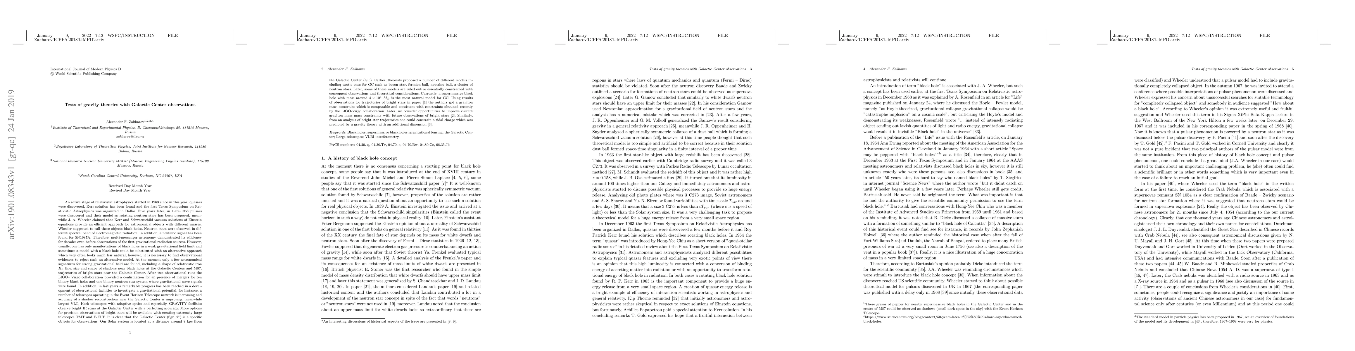 An active stage of relativistic astrophysics started in 1963 since in this year, quasars were discovered, Kerr solution has been found and the first Texas Symposium on Relativistic Astrophysics was organized in Dallas. Five years later, in 1967--1968 pulsars were discovered and their model as rotating neutron stars has been proposed, meanwhile J. A. Wheeler claimed that Kerr and Schwarzschild vacuum solutions of Einstein equations provide an efficient approach for astronomical objects with different masses. Wheeler suggested to call these objects black holes. Neutron stars were observed in different spectral band of electromagnetic radiation. In addition, a neutrino signal has been found for SN1987A. Therefore, multi-messenger astronomy demonstrated its efficiency for decades even before observations of the first gravitational radiation sources. However, usually, one has only manifestations of black holes in a weak gravitational field limit and sometimes a model with a black hole could be substituted with an alternative approach which very often looks much less natural, however, it is necessary to find observational evidences to reject such an alternative model. After two observational runs the LIGO-- Virgo collaboration provided a confirmation for an presence of mergers for ten binary black holes and one binary neutron star system where gravitational wave signals were found. In addition, in last years a remarkable progress has been reached in a development of observational facilities to investigate a gravitational potential, for instance, a number of telescopes operating in the Event Horizon Telescope network is increasing and accuracy of a shadow reconstruction near the Galactic Center is improving, meanwhile largest VLT, Keck telescopes with adaptive optics and especially, GRAVITY facilities observe bright IR stars at the Galactic Center with a perfecting accuracy.