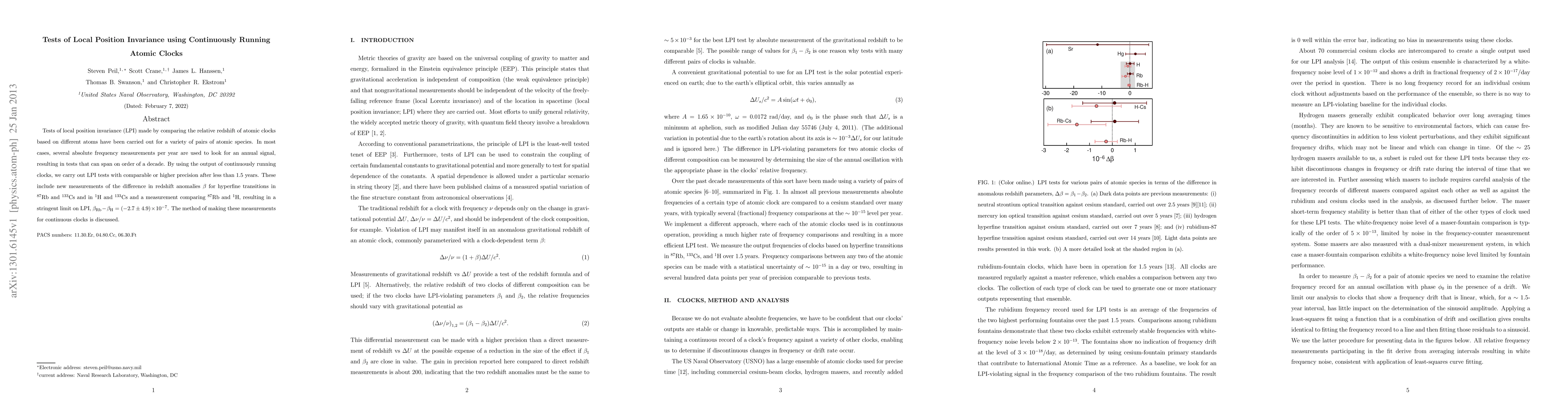 The research utilizes continuously running atomic clocks to test local position invariance (LPI) by comparing the relative redshift of atomic clocks based on different atoms, achieving high precision with less than 1.5 years of data.