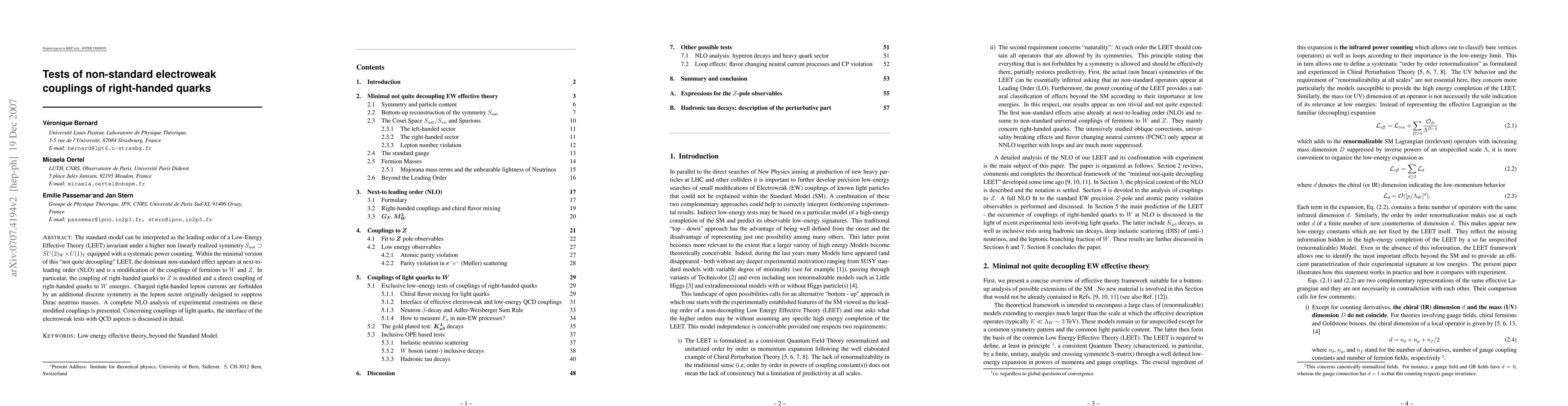 The standard model can be interpreted as the leading order of a Low-Energy Effective Theory (LEET) invariant under a higher non linearly realized symmetry $S_{nat}\supset SU(2)_W \times U(1)_Y$ equipped with a systematic power counting. Within the minimal version of this ``not quite decoupling'' LEET, the dominant non-standard effect appears at next-to-leading order (NLO) and is a modification of the couplings of fermions to W and Z. In particular, the coupling of right-handed quarks to Z is modified and a direct coupling of right-handed quarks to W emerges. Charged right-handed lepton currents are forbidden by an additional discrete symmetry in the lepton sector originally designed to suppress Dirac neutrino masses. A complete NLO analysis of experimental constraints on these modified couplings is presented. Concerning couplings of light quarks, the interface of the electroweak tests with QCD aspects is discussed in detail.