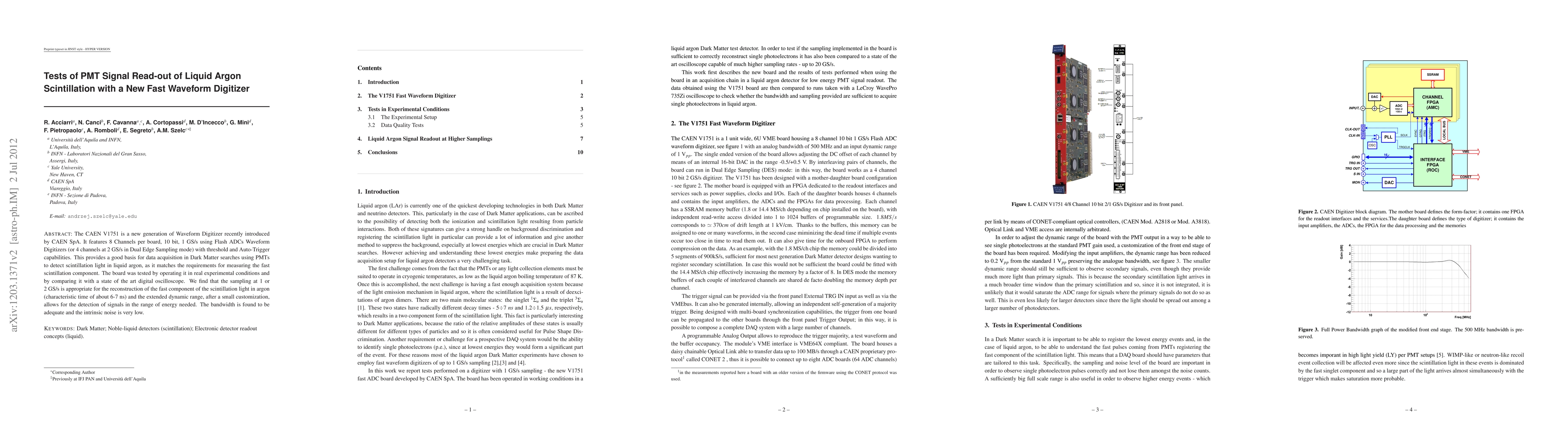 This paper tests the CAEN V1751 Waveform Digitizer for PMT signal read-out in liquid argon scintillation experiments, finding its high sampling rate and dynamic range suitable for detecting fast scintillation components. The device's low noise and adequate bandwidth make it effective for Dark Matter search applications.