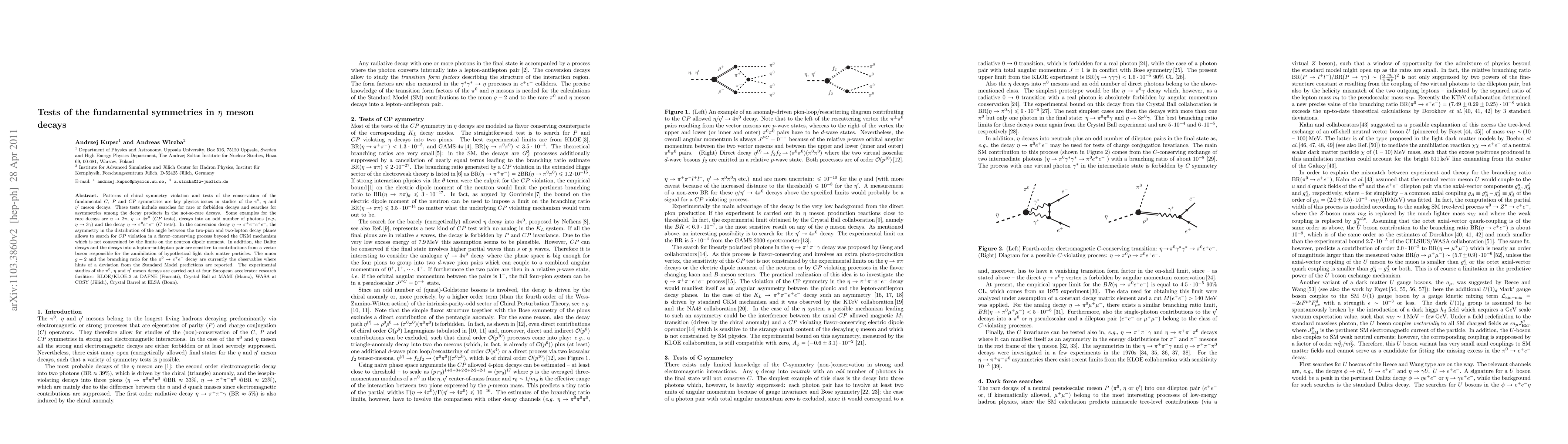 This paper investigates the fundamental symmetries in eta meson decays, focusing on chiral symmetry violation and tests of C, P, and CP conservation. Experimental studies conducted at four European accelerator facilities aim to identify rare decays and asymmetries in decay products.