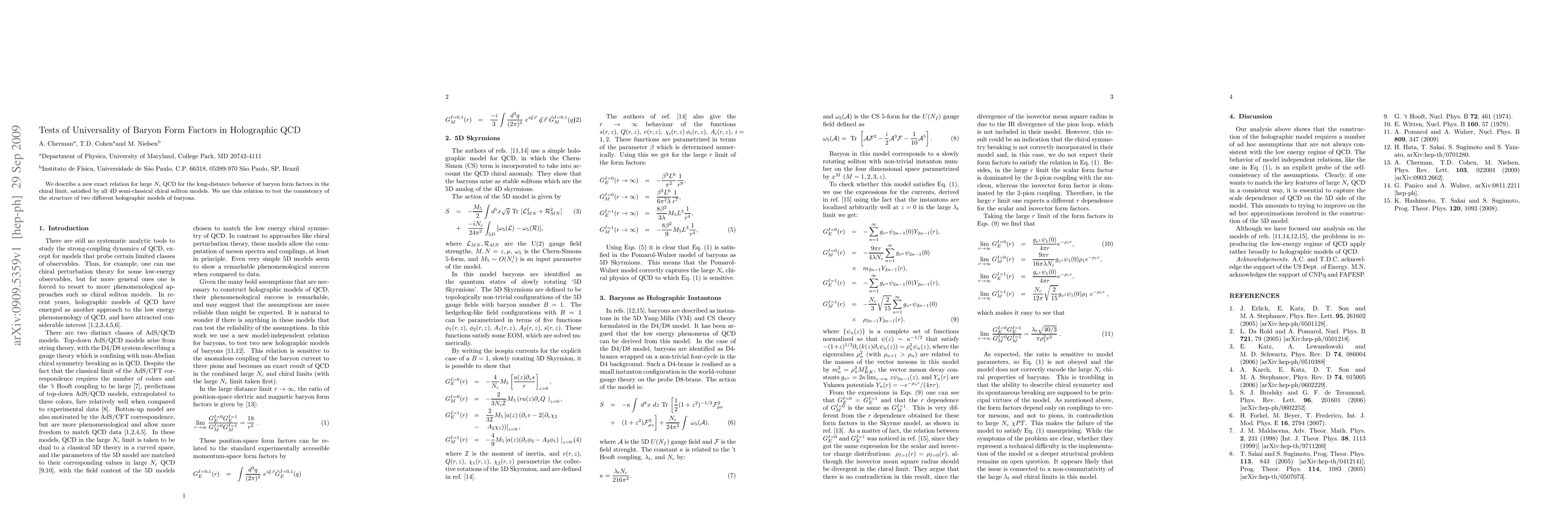 We describe a new exact relation for large $N_c$ QCD for the long-distance behavior of baryon form factors in the chiral limit, satisfied by all 4D semi-classical chiral soliton models. We use this relation to test the consistency of the structure of two different holographic models of baryons.