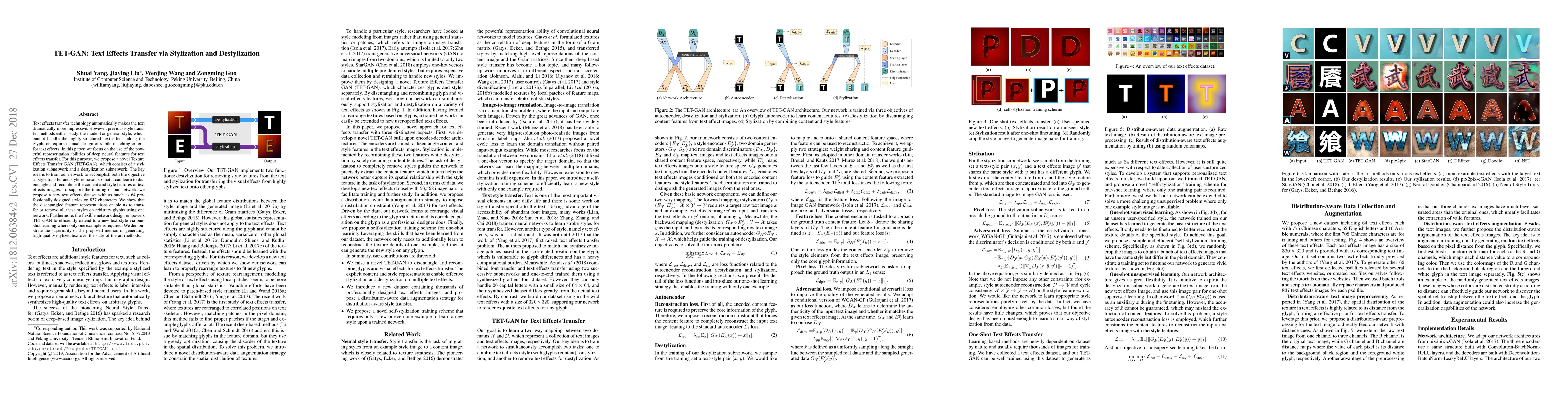 The TET-GAN model introduces a novel approach for text effects transfer using stylization and destylization, enabling the automatic enhancement of text appearance. It achieves superior results by disentangling content and style features, supported by a new dataset with 64 styles and 837 characters.