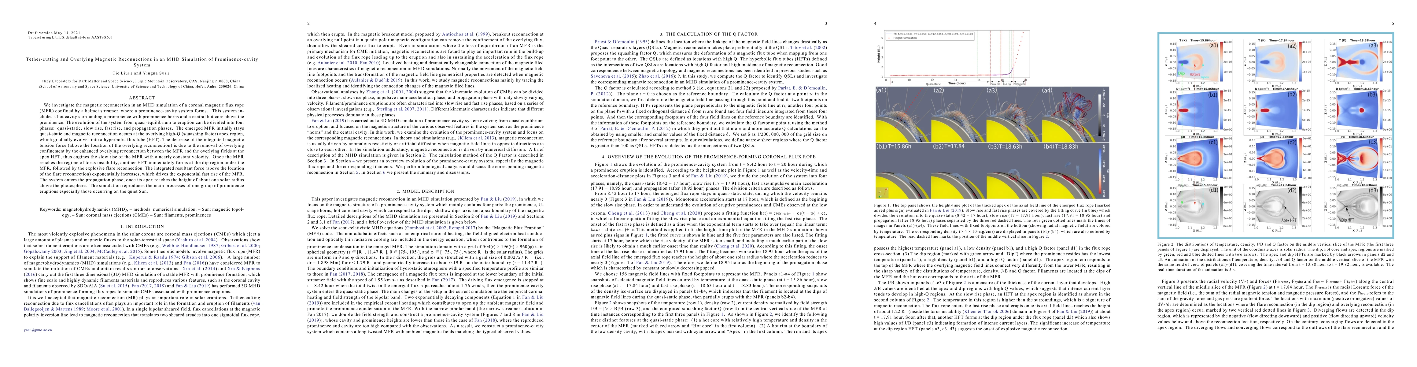 This MHD simulation explores magnetic reconnection in a coronal magnetic flux rope, detailing four phases leading to a prominence eruption. Overlying reconnection at the apex drives the slow rise of the flux rope, while reconnection at the dip region triggers explosive flare activity, causing a rapid rise. The study captures key processes of quiet Sun prominence eruptions.
