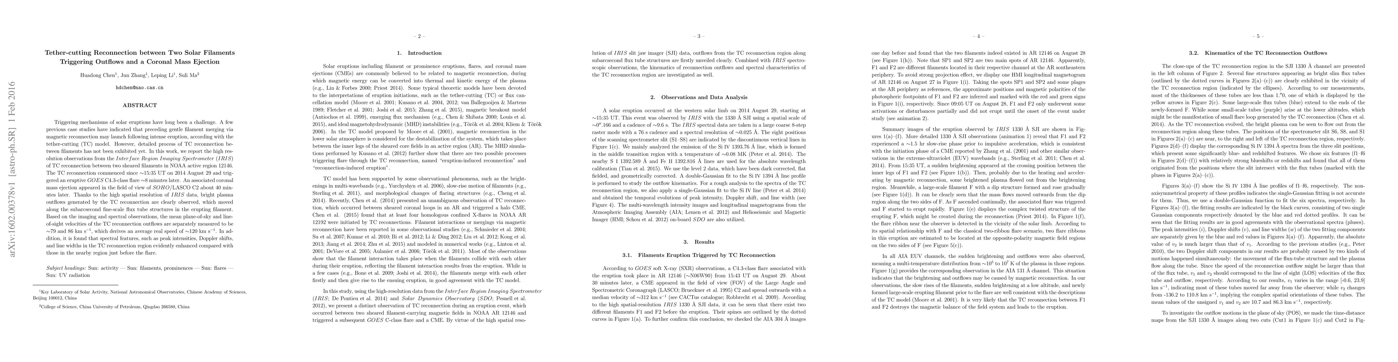 This study reports high-resolution observations of tether-cutting reconnection between two solar filaments, leading to an eruptive flare and coronal mass ejection, with plasma outflows reaching speeds of 120 km/s. The detailed process was observed using IRIS, revealing enhanced spectral features in the reconnection region.