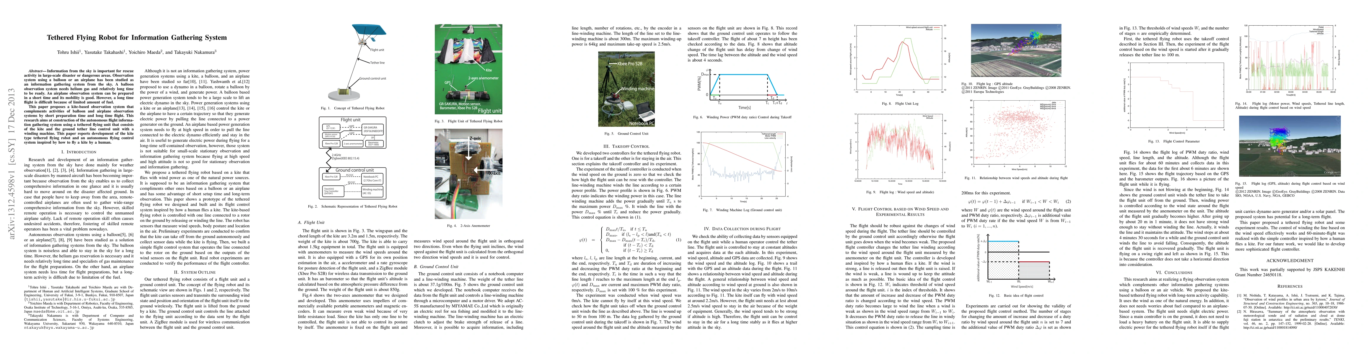 This research aims to complement existing information gathering systems using balloons or airplanes by offering a tethered flying robot with short preparation time and long flight duration, eliminating fuel concerns and reducing the need for heavy batteries on the flight unit.