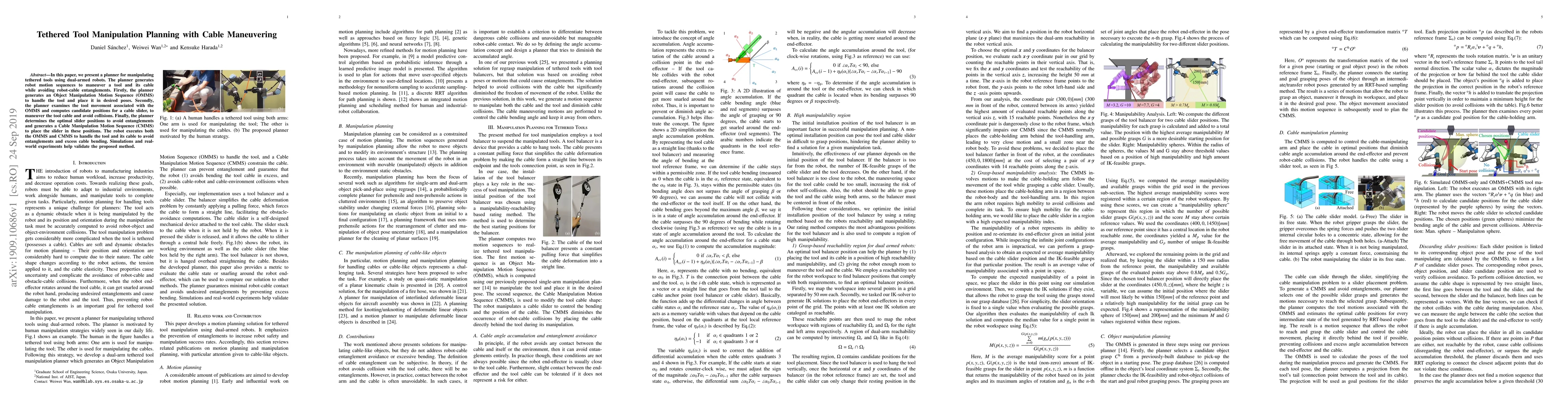 This paper introduces a planner for dual-armed robots to manipulate tethered tools, generating motion sequences to avoid cable entanglements. It first creates an Object Manipulation Motion Sequence (OMMS) and then computes a Cable Manipulation Motion Sequence (CMMS) to maneuver the cable, validated through simulations and real-world experiments.