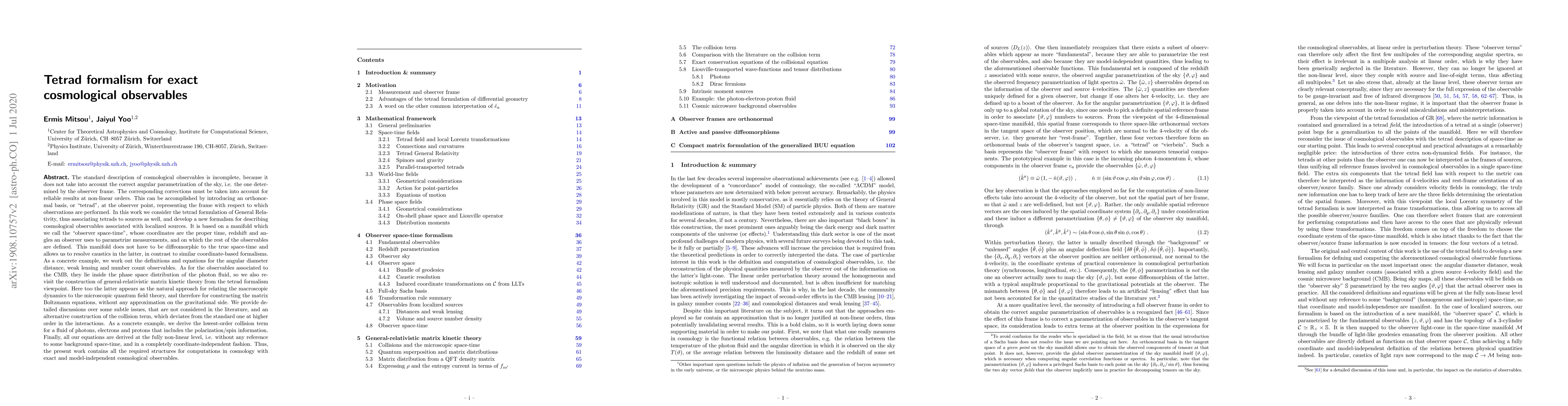 This research introduces a tetrad formalism for cosmological observables, utilizing an 'observer space-time' manifold with proper time, redshift, and angular coordinates. It aims to correct angular parametrization inconsistencies in standard cosmological descriptions, resolving caustics and enabling accurate non-linear order results for observables like angular diameter distance, weak lensing, and number counts. The methodology also extends to CMB observables by linking macroscopic dynamics to microscopic quantum field theory through general-relativistic matrix kinetic theory, all without approximations on the gravitational side.
