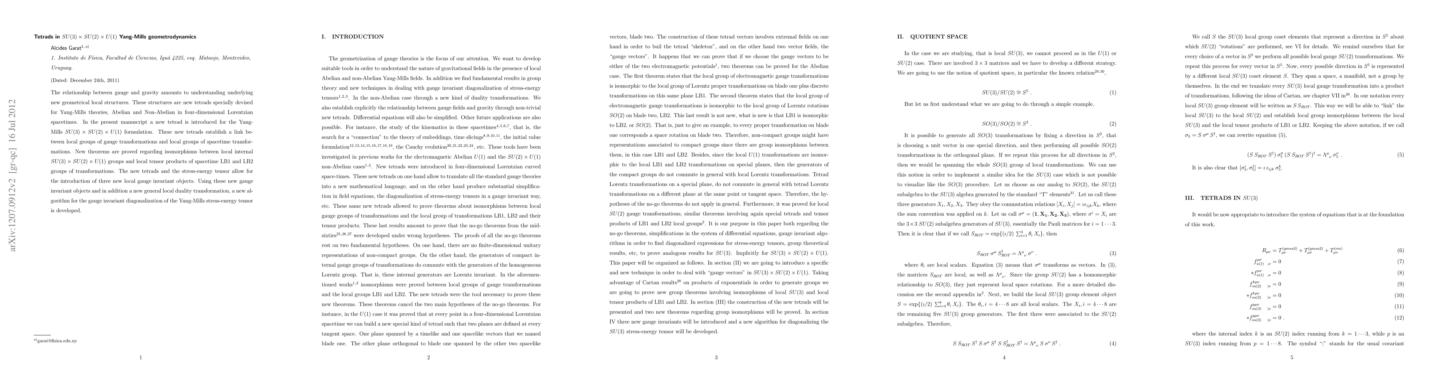 This research introduces new tetrads in the SU(3) X SU(2) X U(1) Yang-Mills formulation to link gauge transformations with spacetime transformations, proving theorems on isomorphisms between local groups. It also develops a new algorithm for diagonalizing the Yang-Mills stress-energy tensor using gauge invariant objects and a local duality transformation.