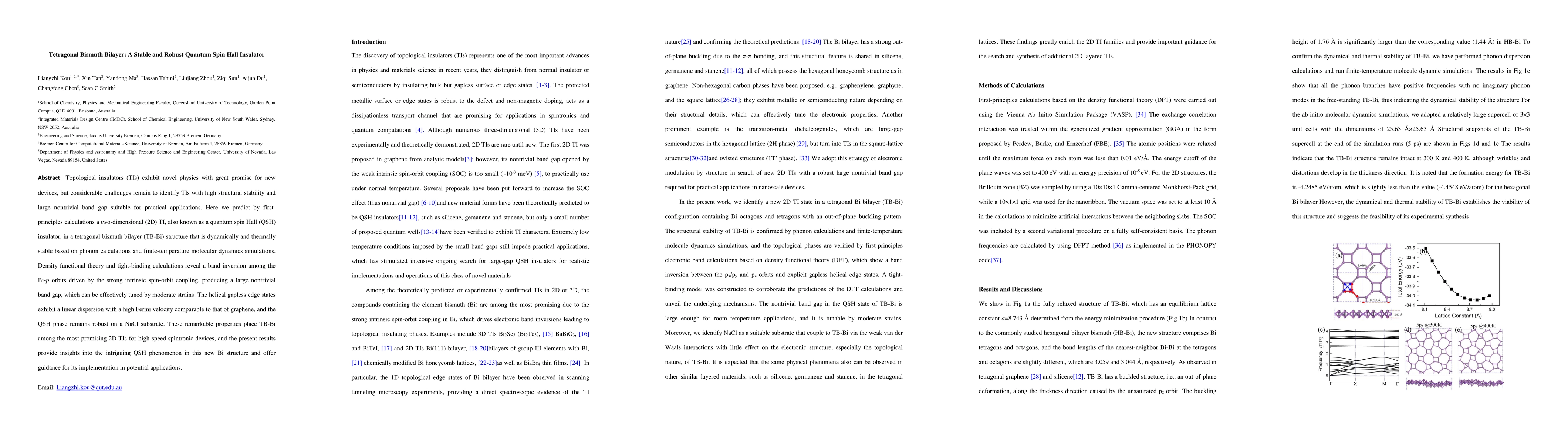 The paper predicts a new, stable 2D topological insulator, termed tetragonal bismuth bilayer (TB-Bi), using first-principles calculations and molecular dynamics simulations. TB-Bi exhibits a large nontrivial band gap, helical edge states with high Fermi velocity, and robustness on NaCl substrate, making it a promising candidate for spintronic devices.