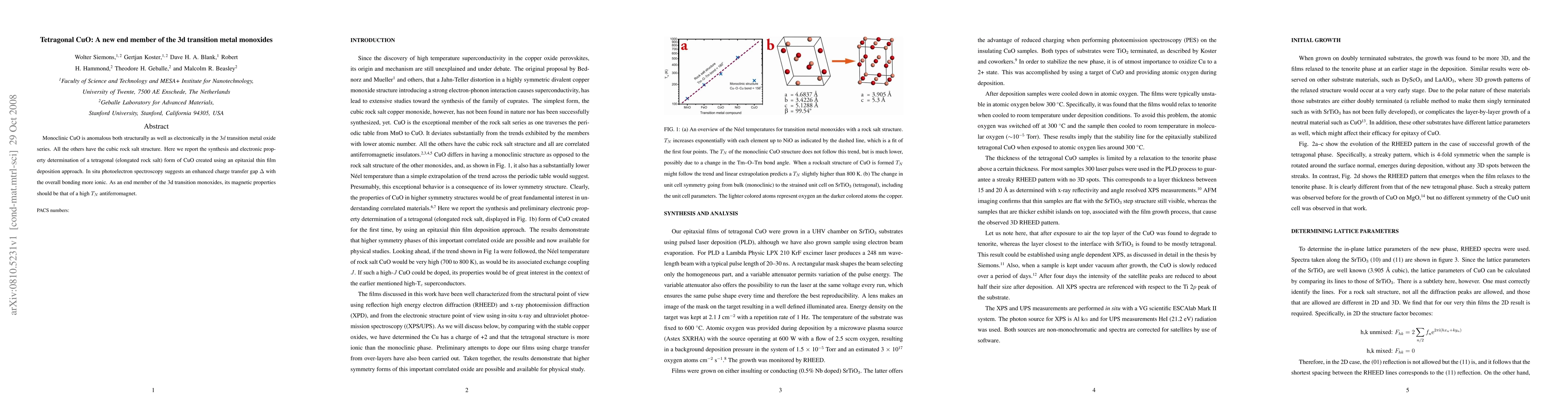 Monoclinic CuO is anomalous both structurally as well as electronically in the 3$d$ transition metal oxide series. All the others have the cubic rock salt structure. Here we report the synthesis and electronic property determination of a tetragonal (elongated rock salt) form of CuO created using an epitaxial thin film deposition approach. In situ photoelectron spectroscopy suggests an enhanced charge transfer gap $\Delta$ with the overall bonding more ionic. As an end member of the 3d transition monoxides, its magnetic properties should be that of a high $T_N$ antiferromagnet.