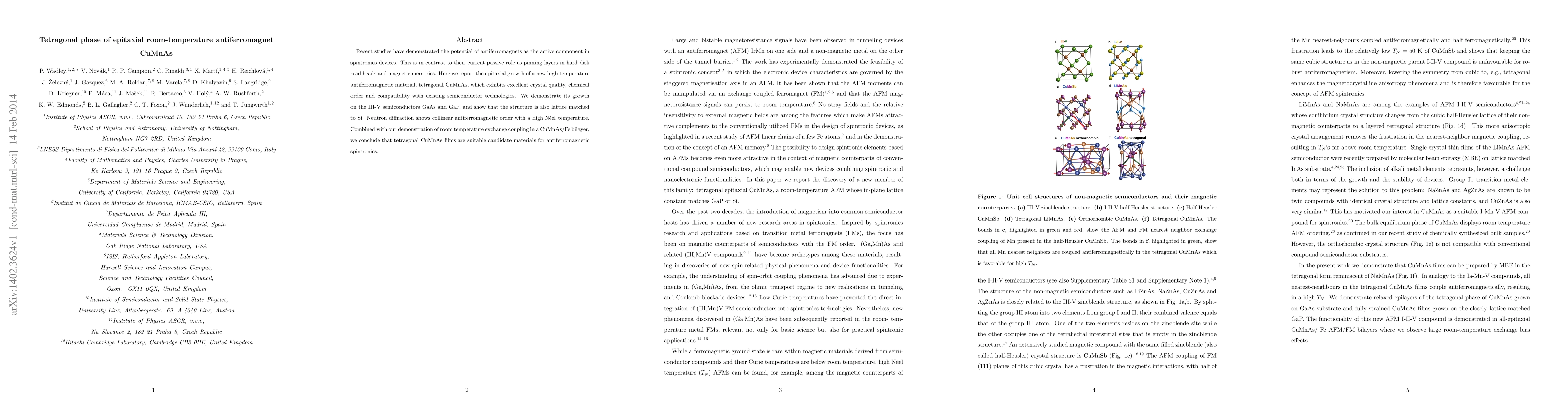 This paper reports the epitaxial growth of tetragonal CuMnAs, a high-temperature antiferromagnetic material, on GaAs, GaP, and Si substrates, demonstrating its potential for antiferromagnetic spintronics applications. Neutron diffraction confirms its collinear antiferromagnetic order and high Néel temperature, alongside successful room-temperature exchange coupling in CuMnAs/Fe bilayers.