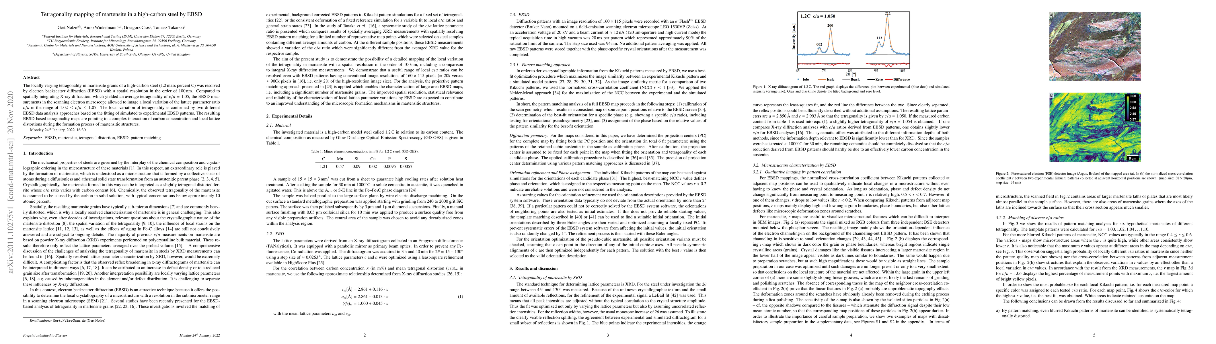 This study uses electron backscatter diffraction (EBSD) to map the locally varying tetragonality in martensite grains of high-carbon steel, revealing lattice parameter ratios ranging from 1.02 to 1.07, in contrast to the average ratio of 1.05 obtained via X-ray diffraction. The findings suggest a complex interplay between carbon concentration and local lattice distortions in martensite formation.