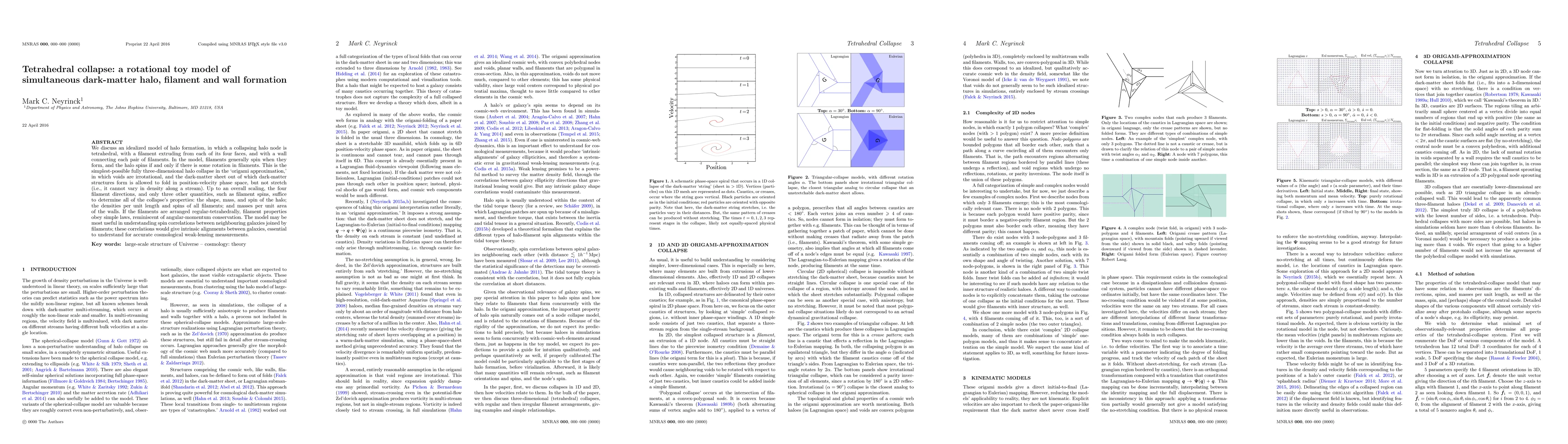 We discuss an idealized model of halo formation, in which a collapsing halo node is tetrahedral, with a filament extruding from each of its four faces, and with a wall connecting each pair of filaments. In the model, filaments generally spin when they form, and the halo spins if and only if there is some rotation in filaments. This is the simplest-possible fully three-dimensional halo collapse in the 'origami approximation,' in which voids are irrotational, and the dark-matter sheet out of which dark-matter structures form is allowed to fold in position-velocity phase space, but not stretch (i.e., it cannot vary in density along a stream). Up to an overall scaling, the four filament directions, and only three other quantities, such as filament spins, suffice to determine all of the collapse's properties: the shape, mass, and spin of the halo; the densities per unit length and spins of all filaments; and masses per unit area of the walls. If the filaments are arranged regular-tetrahedrally, filament properties obey simple laws, reminiscent of angular-momentum conservation. The model may be most useful in understanding spin correlations between neighboring galaxies joined by filaments; these correlations would give intrinsic alignments between galaxies, essential to understand for accurate cosmological weak-lensing measurements.