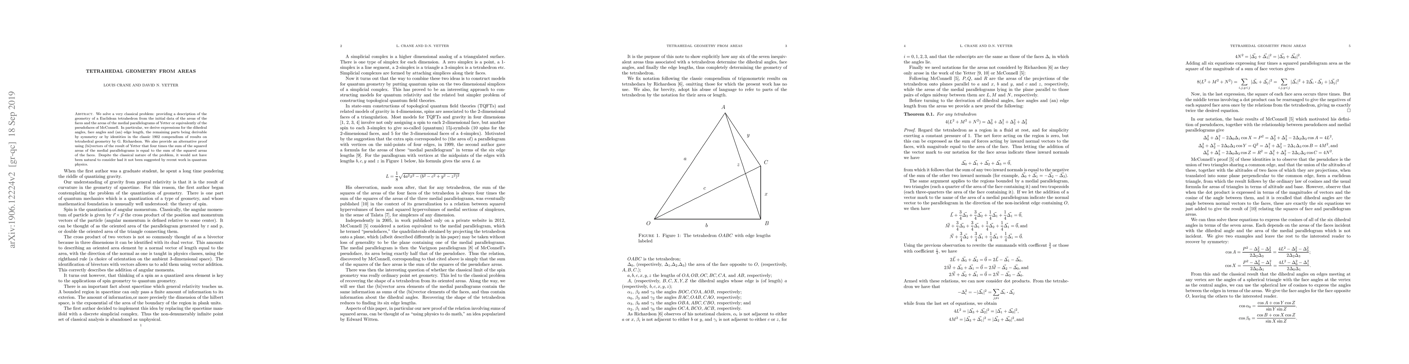 We solve a very classical problem motivated by considerations in quantum gravity: providing a description of the geometry of a Euclidean tetrahedron from the initial data of the areas of the faces and the areas of the medial parallelograms of Yetter or equivalently of the pseudofaces of McConnell. In particular, we derive expressions for the dihedral angles, face angles and (an) edge length, the remaining parts being derivable by symmetry or by identities in the classic 1902 compendium of results on tetrahedral geometry of Richardson. We also provide an alternative proof using (bi)vectors of the result of Yetter that four times the sum of the squared areas of the medial parallelograms is equal to the sum of the squared areas of the faces. The updated version corrects several errors and provides better historical context for the result.