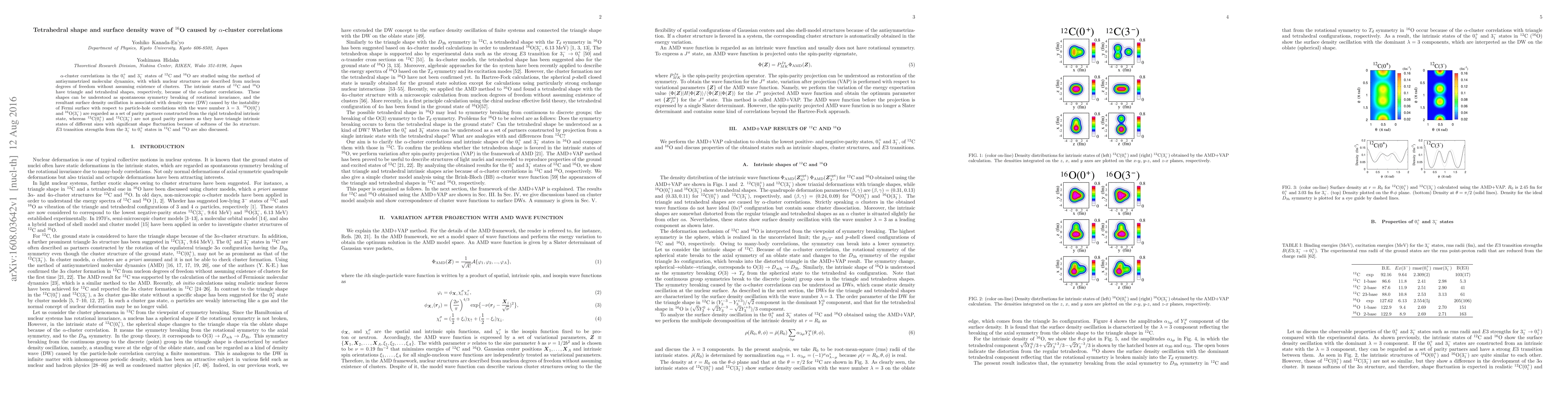 $\alpha$-cluster correlations in the $0^+_1$ and $3^-_1$ states of $^{12}$C and $^{16}$O are studied using the method of antisymmetrized molecular dynamics, with which nuclear structures are described from nucleon degrees of freedom without assuming existence of clusters. The intrinsic states of $^{12}$C and $^{16}$O have triangle and tetrahedral shapes, respectively, because of the $\alpha$-cluster correlations. These shapes can be understood as spontaneous symmetry breaking of rotational invariance, and the resultant surface density oscillation is associated with density wave (DW) caused by the instability of Fermi surface with respect to particle-hole correlations with the wave number $\lambda=3$. $^{16}$O($0^+_1$) and $^{16}$O($3^-_1$) are regarded as a set of parity partners constructed from the rigid tetrahedral intrinsic state, whereas $^{12}$C($0^+_1$) and $^{12}$C($3^-_1$) are not good parity partners as they have triangle intrinsic states of different sizes with significant shape fluctuation because of softness of the $3\alpha$ structure. $E3$ transition strengths from the $3^-_1$ to $0^+_1$ states in $^{12}$C and $^{16}$O are also discussed.