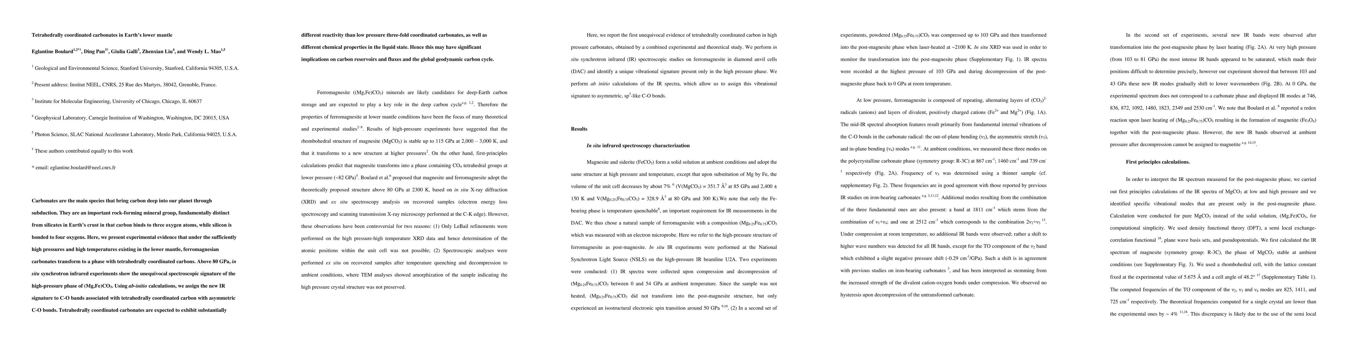 This study reveals that under the high pressures and temperatures of the Earth's lower mantle, ferromagnesian carbonates transform into a phase with tetrahedrally coordinated carbons, as evidenced by synchrotron infrared experiments and ab-initio calculations. This transformation may significantly alter carbon's reactivity and influence the global geodynamic carbon cycle.