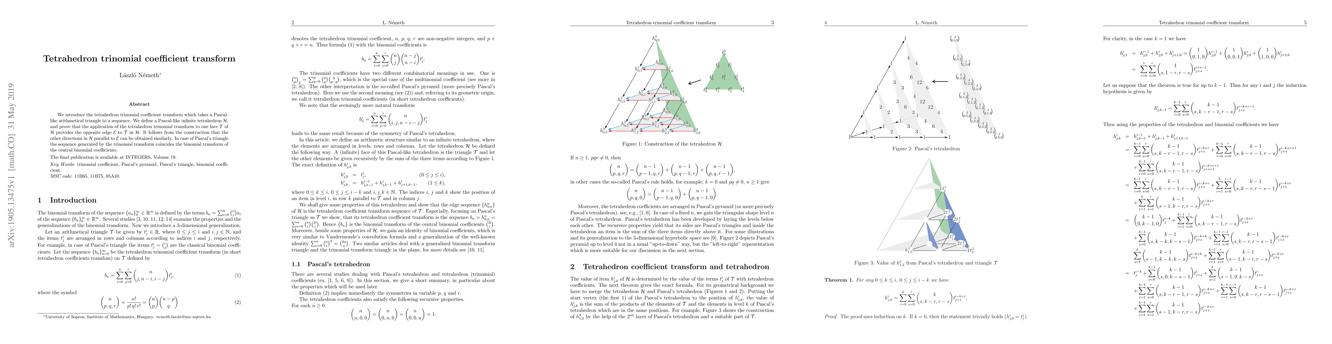 This paper introduces a tetrahedron trinomial coefficient transform converting a Pascal-like arithmetical triangle into a sequence. The authors define a Pascal-like infinite tetrahedron H and prove that applying this transform to one face of H yields the opposite edge, extending the method to other parallel directions.